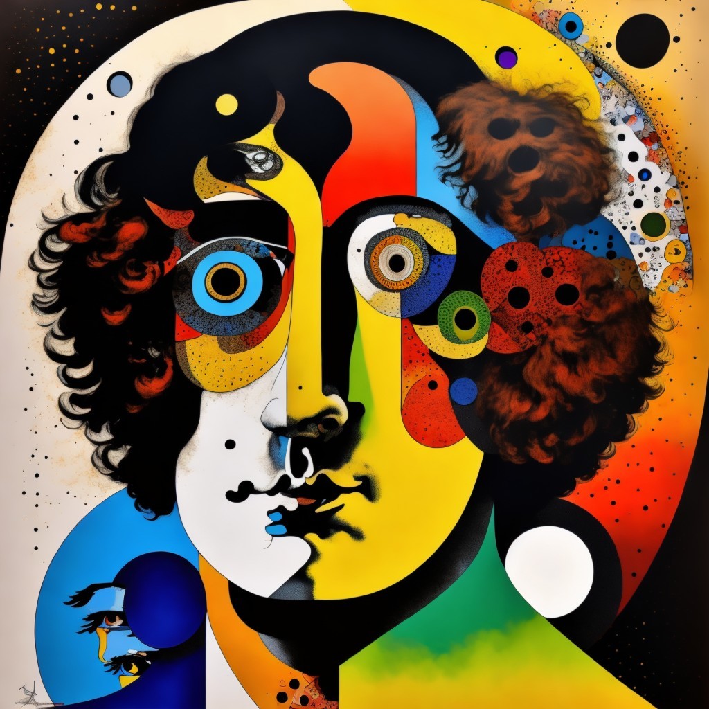 A vibrant, abstract painting featuring a colorful, fragmented face with swirling patterns and shapes, signed by Vlad V 2024.