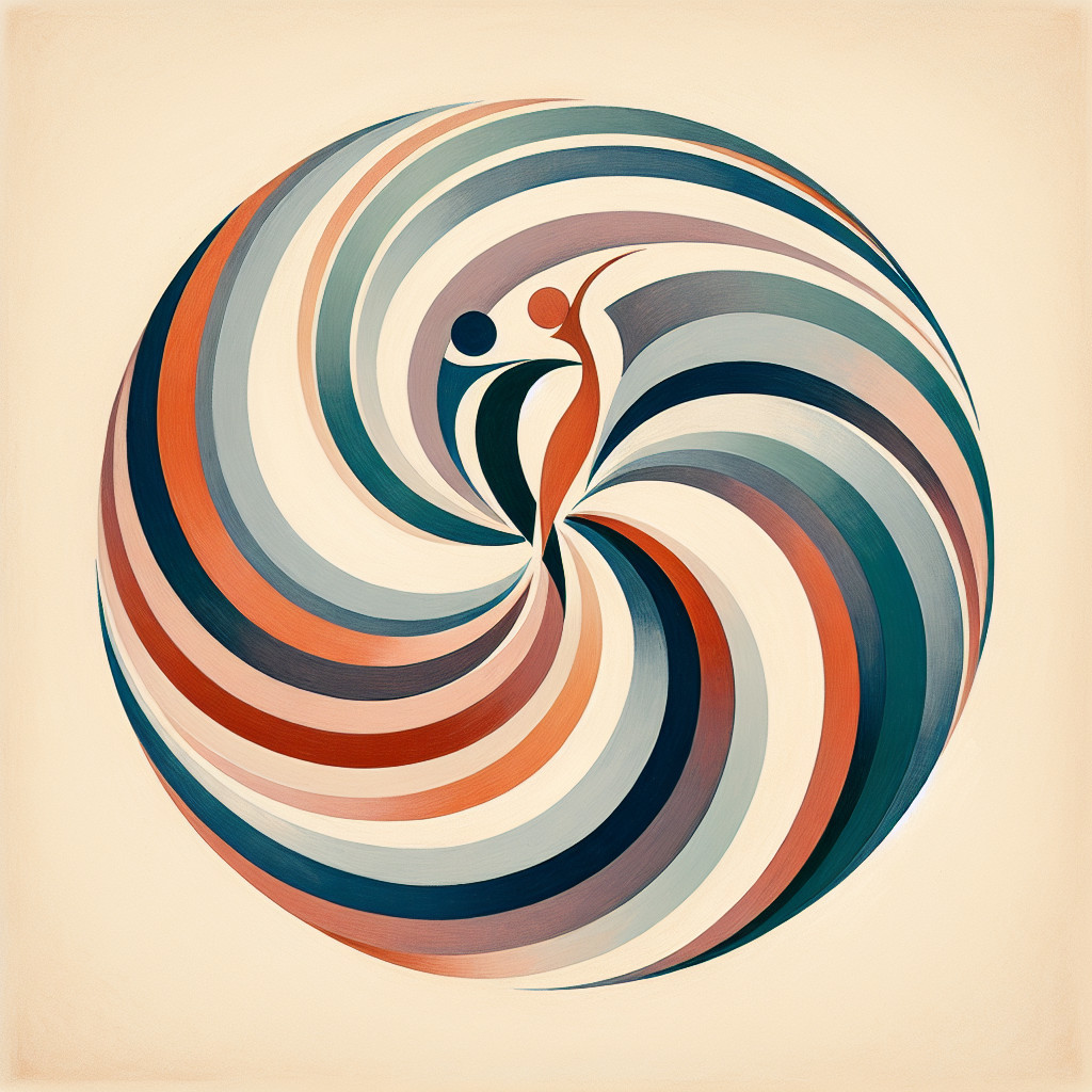 The image features a dynamic swirl of vibrant colors in a circular pattern, suggesting movement and connection, with two abstract figures at the center, symbolizing unity and harmony.