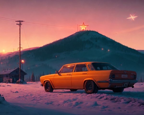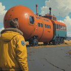 A colorful, whimsical train-like vehicle with vibrant patterns and a large, decorative head at the front, set against a backdrop of mountains and a blue sky, creating a surreal landscape.