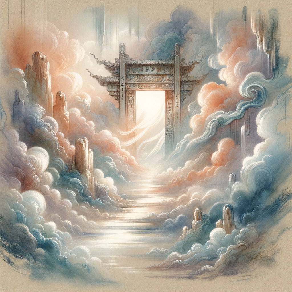 A serene landscape featuring majestic mountains and lush trees, with rolling waves and a rising sun. A bird soars above, capturing the tranquility of nature in an artistic harmony.