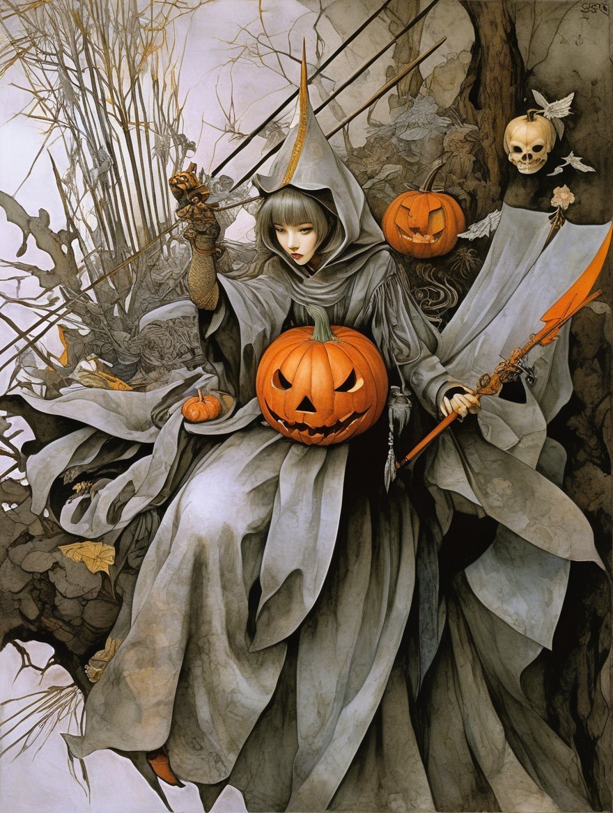 Legend of the Girl of the underworld. Halloween. Medieval Japanese Artists Sumi-e Style, Velvet Black, Shabby, Dull Gold, Amber Gray, Golden Ratio, Surreal Fantasy, Elegant, High Definition Ultra Fine 3D Line, Zenangle Style, Watercolor Patchwork ,