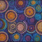 A vibrant mosaic landscape featuring a sunset behind purple mountains, with glittering sun rays, lush palm trees, and a colorful riverbank decorated with smooth stones.