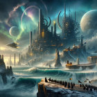 A futuristic landscape features towering alien structures, flying saucers, and a dramatic sky. Snowy mountains and rugged terrain set the scene for an epic sci-fi battle, highlighting advanced technology.