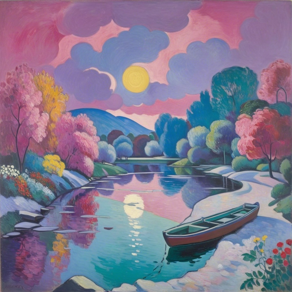 A vibrant, colorful landscape featuring a serene river and a single boat. Lush trees display pink and orange hues under a radiant sunset, reflecting a dreamlike, tranquil atmosphere.
