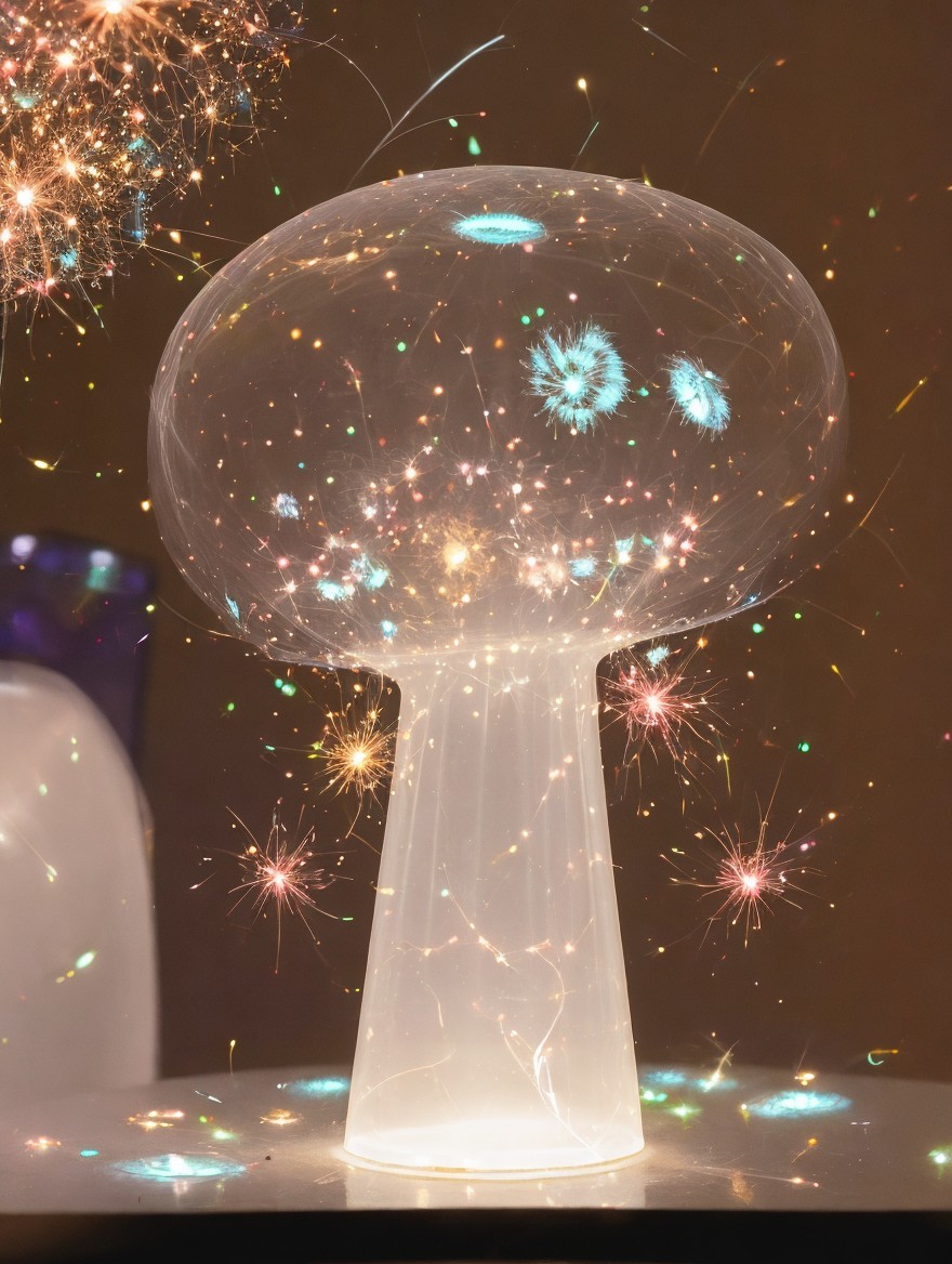 An ethereal sculpture with illuminated, swirling tendrils emanating from a white base, creating a mesmerizing, ghostly effect.