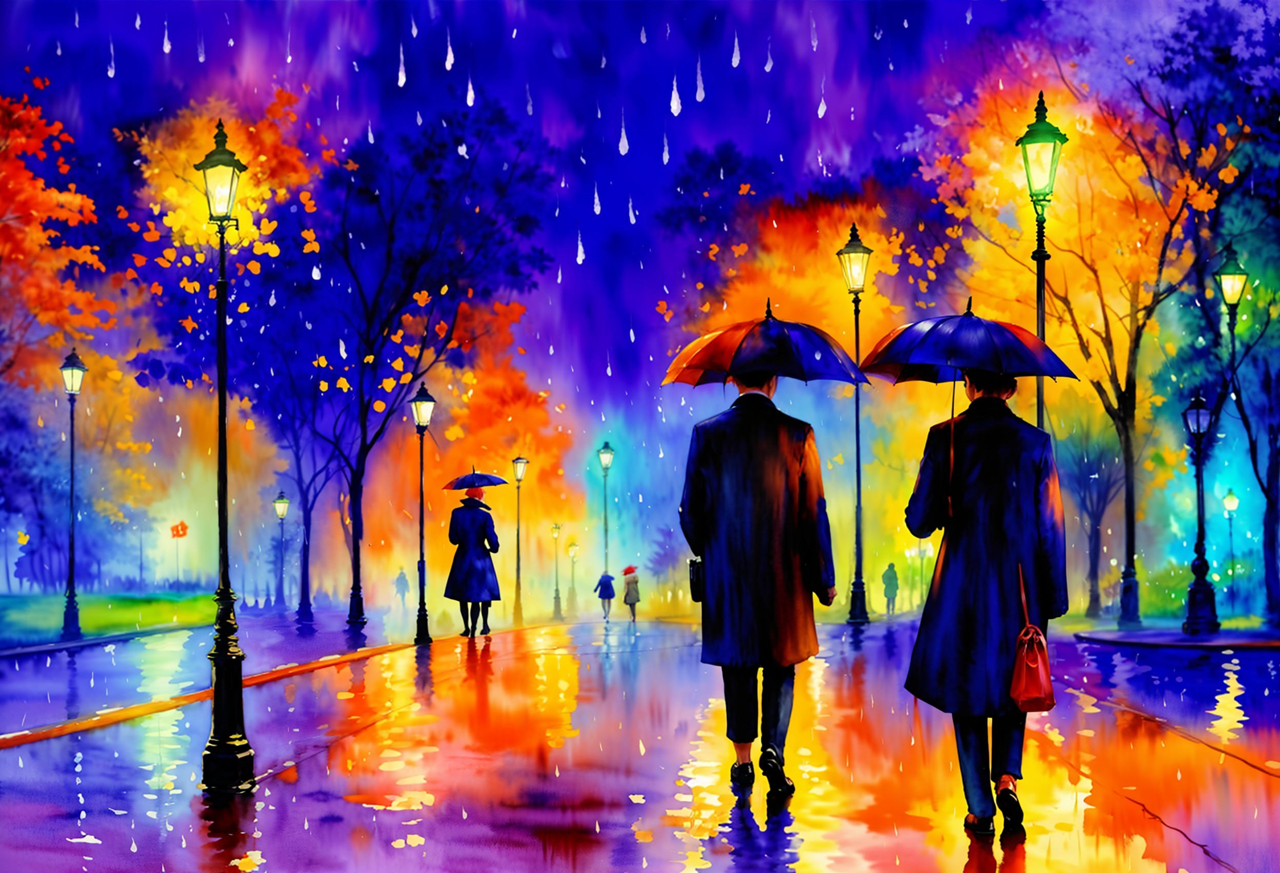 A park is bathed in colourful reflections from lampposts and rainy puddles. Figures in coats and umbrellas stroll amid a dreamlike landscape of warm hues and falling rain.