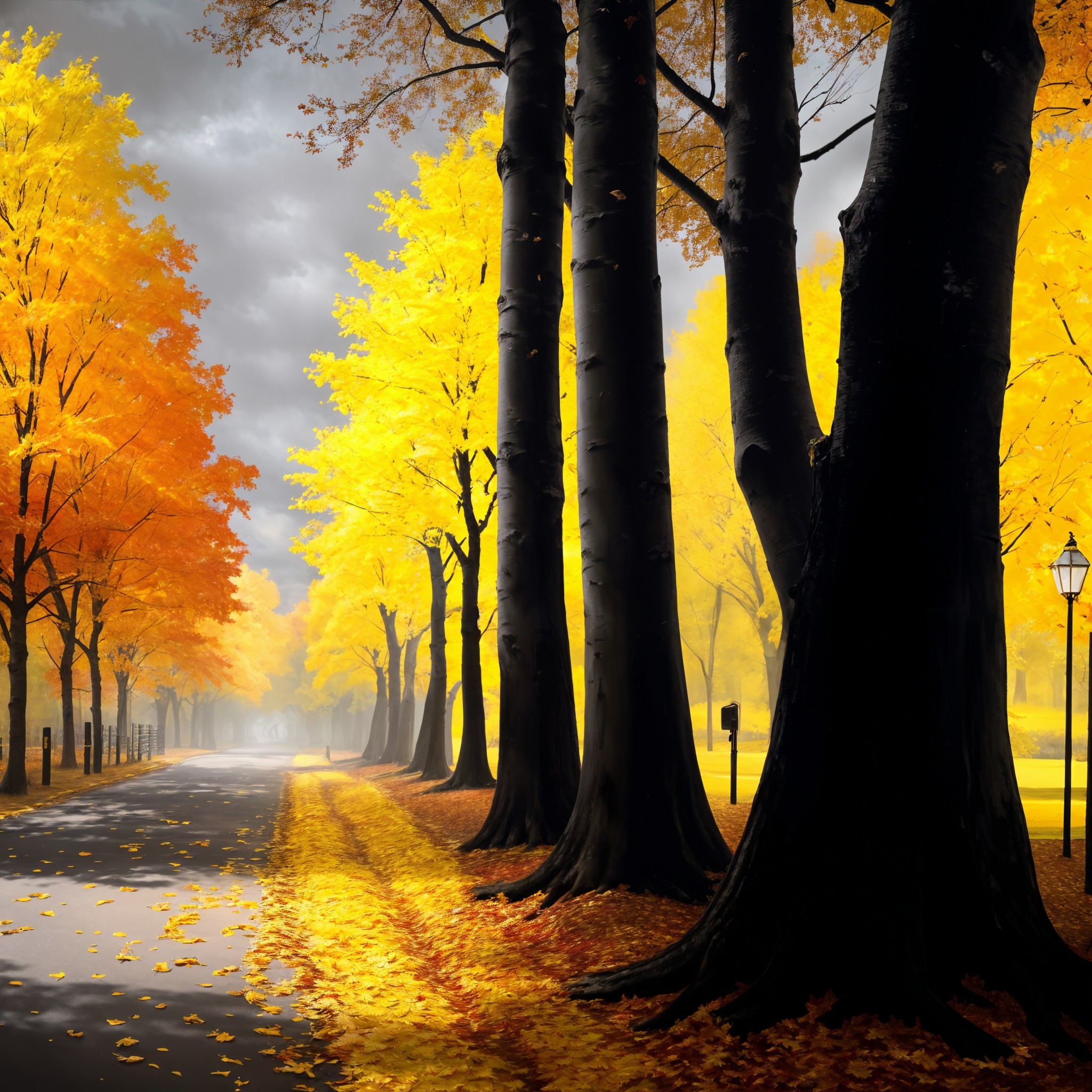 Prompt: "(((glazed oil painting masterpiece))) autumn leaves spread around from birch, oak and maple a single oak leaf lying on the ground. grey black polished wet park path. oak trees are lined up on each side in an organized manner. after each oak tree, a ground spotlight shines in yellow. in the middle of the street, a black silhouette is seen wandering down the street, wearing a long coat, boots and hat, carrying a ((violin case)). dark atmosphere, thick brush, hdr, award winning, crisp quality"
