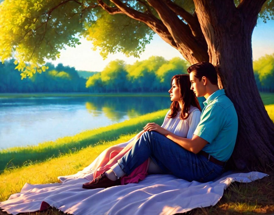 Prompt: "A retro-dressed couple sitting on a blanket under the spreading tree, by the river. They are looking at each other's eyes. Impressionistic style."