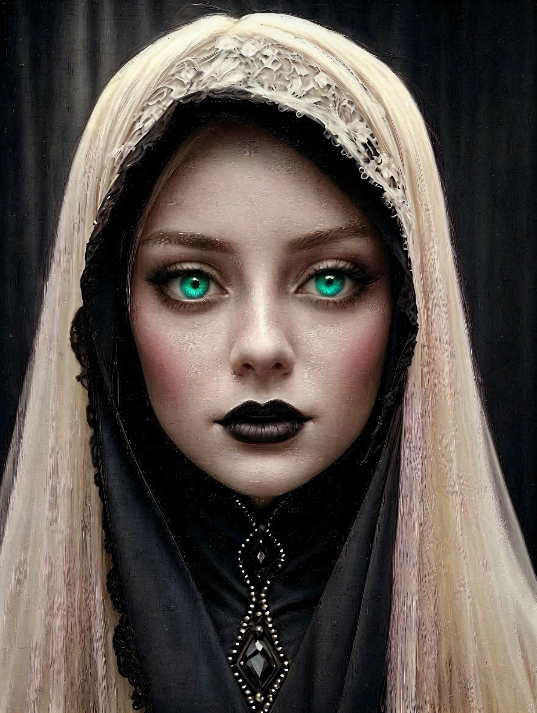 A striking portrait of a young woman with long, platinum blonde hair and captivating green eyes, adorned in a dark hooded cloak. Her bold makeup features dark lips and intricate details.