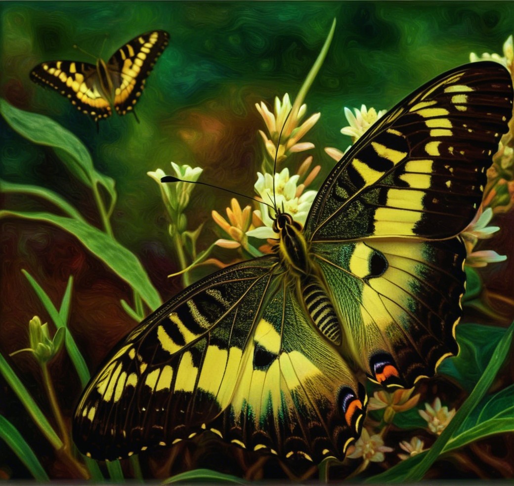 A vibrant, dreamlike scene featuring two colorful butterflies surrounded by lush, abstract flowers in shades of purple, blue, and teal, evoking a sense of whimsical beauty in nature.