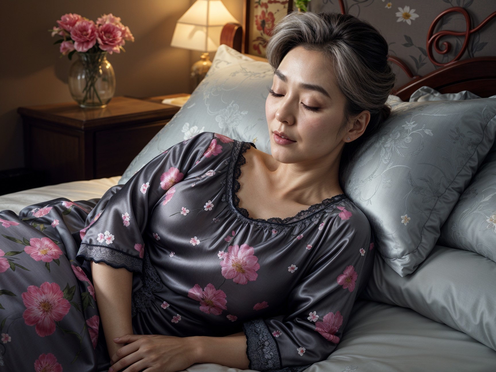 Serene Woman in Elegant Bedroom with Floral Accents