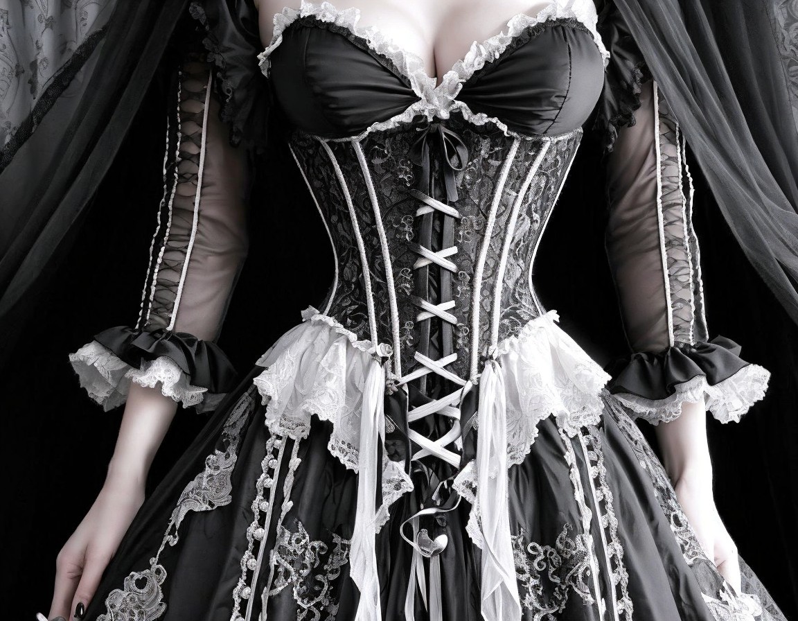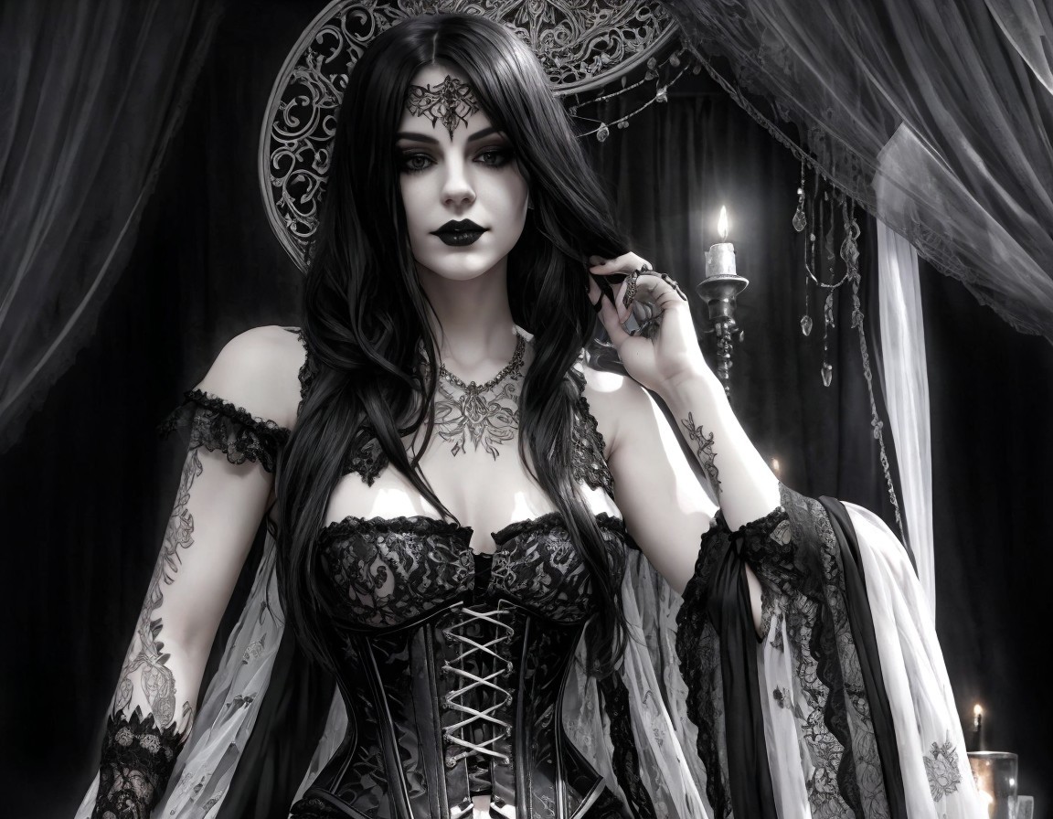 A monochrome image of a witch in traditional clothing with intricate makeup and detailed attire, exuding a mysterious aura.