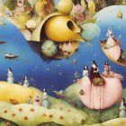 A surreal landscape filled with vibrant colors, featuring whimsical figures in flowing garments, floating on boats and hills, surrounded by fantastical elements like fish and balloons.