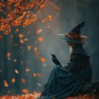 In a foggy forest, a young woman in a black gown and pointed witch hat sits on a log, surrounded by swirling autumn leaves and a perched raven, evoking a magical, enchanting atmosphere.
