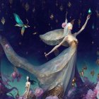 A surreal scene features a graceful figure with flowing attire, reaching for colorful, shimmering droplets suspended in a dreamlike, vibrant landscape filled with whimsical shapes and forms.