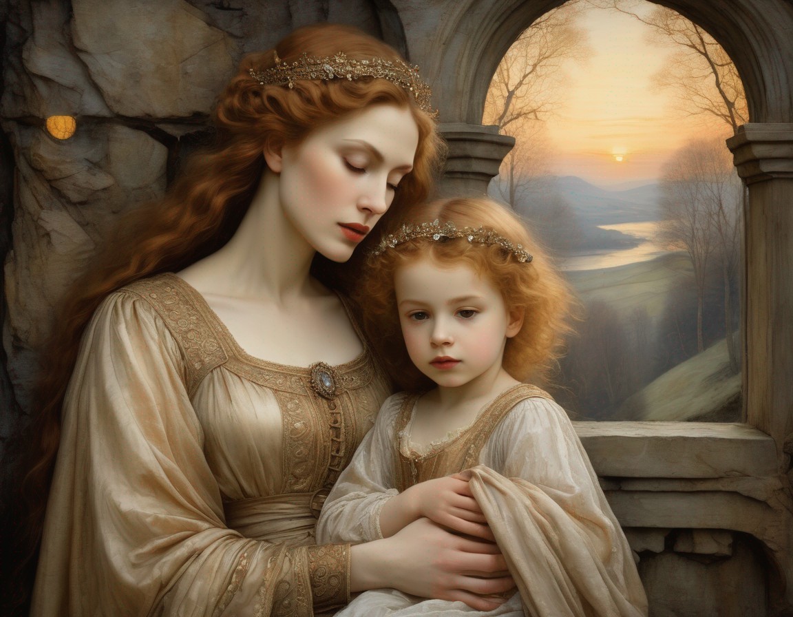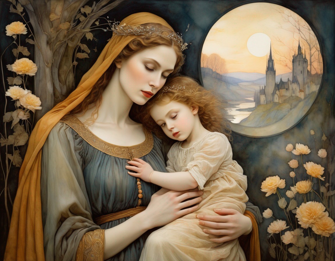 Prompt: Mother and child in the style of Sulamith Wulfing