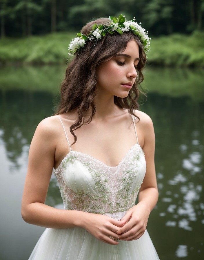 A woman in a white floral dress with a flower crown stands thoughtfully by a serene backdrop, appearing tranquil and elegant.