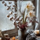 A vase filled with elegant white flowers and cotton sits on a rustic table. Surrounding it are candles, decorative elements, and slices of orange, creating a cozy, warm atmosphere.