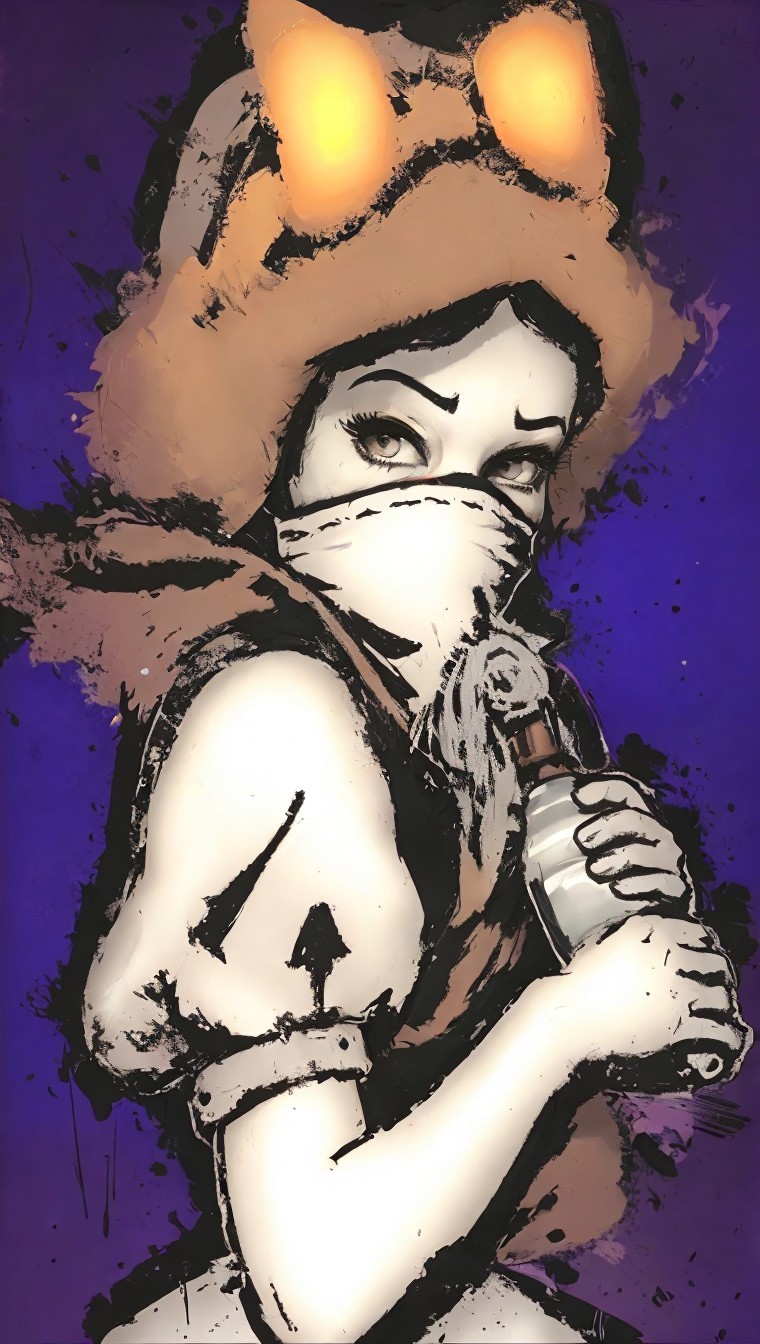 stylized upper body portrait, streetart style, stylized Street art illustration, snowy white holds bomb, mouth is masked, tints of comical sketch art, 3d effects, fine strokes, encaustic lines, iridescent colors, octane render illustration 1.5, Handsome, colored ink drawing, digital artwork in withered pale colors, high detail, muted colors 0.8, intricately detailed, american gothic 0.8, dynamic lighting, art nouveau, (steampunk (triadic color scheme blue, ochre, burgundy) 6:11), inkpunk, background by Margaret Keane, ornamental details in contrast colors, hyper detailed. Watercolor details, upright pose, (dark blue background with tints of Space age style, vivid illumination, intricate surrounding), tints of 1970s advertising art) 7:11), detailed plasticity, ambient occlusion 1.9, grain, plasticity, 3d effects, fine strokes, spiritual essence ,encaustic strokes, tiny flares, anisotropic filtering, shadow mapping 1.9, dynamic lighting, daguerreotype photography style on old paper, muted colors, auracore, hues, mystical symbolism, magical realism, abstract essence, alcoholic inkpunk 1.4, golden ratio, dynamic lighting, raytraced shadows, ethereal,abstract, very stylized illustration 1.8, quilling