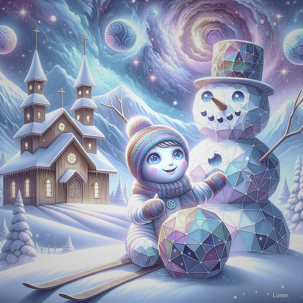 A whimsical winter scene with a cute, colorful character beside a geometric snowman, under a vibrant, starry sky, and churches in the background.