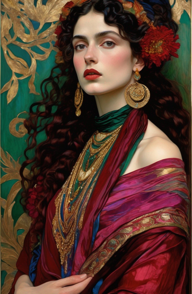 + Prompt:Art nouveau with 3d detail and golden foil, double image, Egon Schiele painting a gypsy priestess in flowing shawls in crimson, maroon, emerald blue room with pillows iridescent blue and green, dynamic poses, silk iridescent texture in watercolor and ink, vibrant colors with gold foil detail, by William Holman Hunt, Tomasz Sętowski, Enki Bilal, Vladimir Fedotko, Pietro Annigoni, Milo Manara, Botticelli, Catrin Welz-Stein, Jean Metzinger, Klimt, perfect eyes, perfect face,