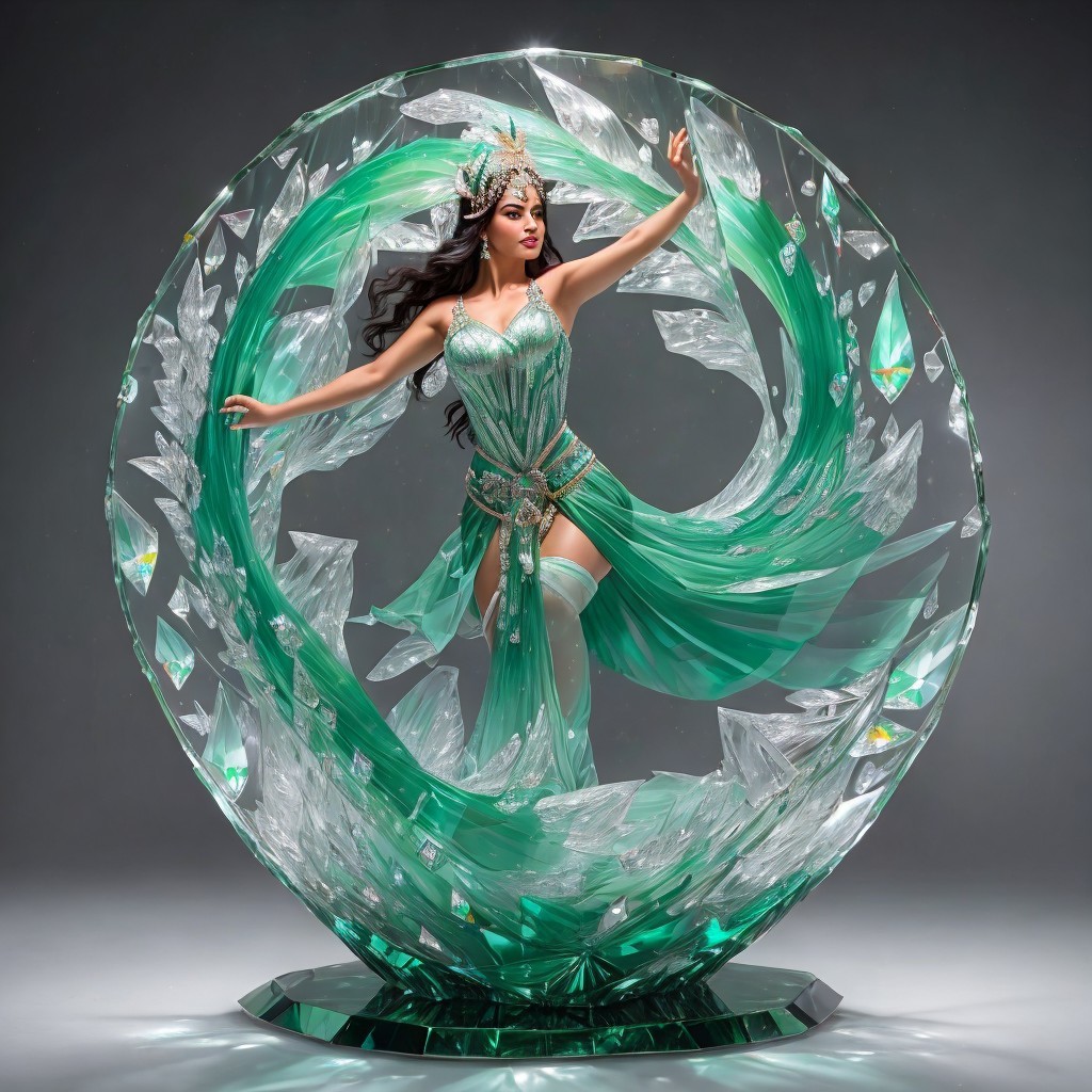 A figurine of a woman with flowing robes and hair, encased in a swirling glass wave, displaying a dance-like pose on a stand.