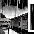 A young child in a cozy hoodie stands on the water's edge, surrounded by charming cottages and vibrant flowers under a serene sky, evoking a sense of peace and wonder in a whimsical landscape.