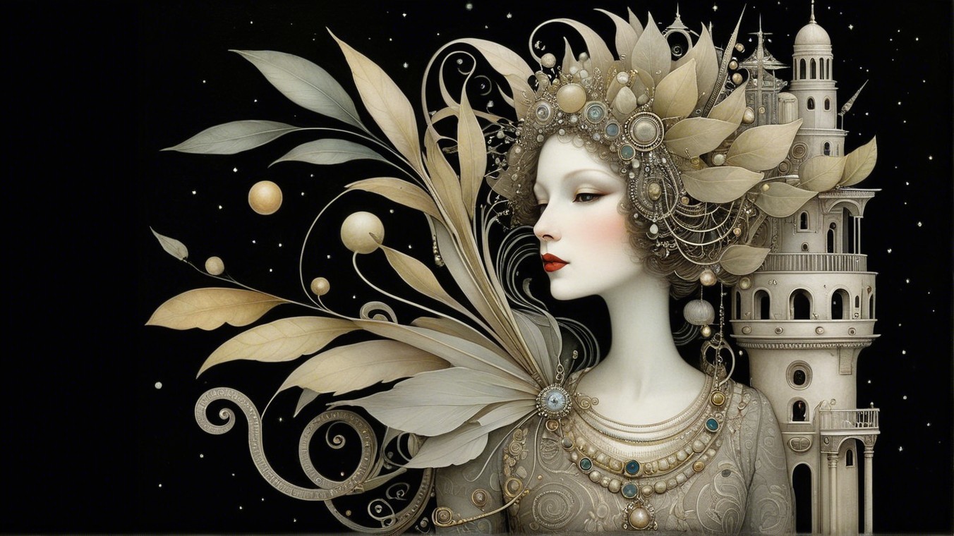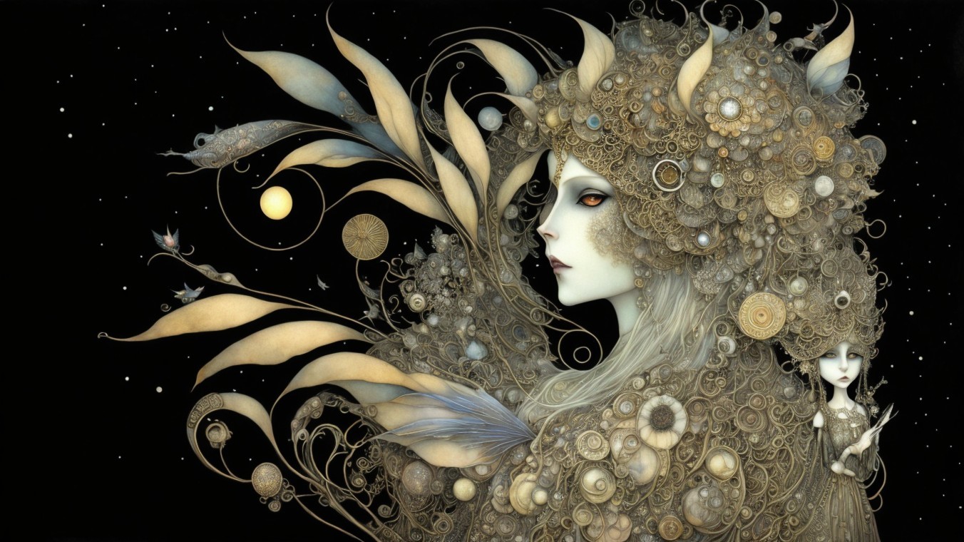 A beautifully adorned woman with flowing hair holds birds in her hand amidst golden leaves. Her intricate jewelry and ethereal presence create a captivating, mystical aura.