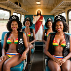 The image features four women in stylish swimsuits, each wearing a black vest, seated in a serene indoor pool. Colorful artwork decorates the background, adding an artistic flair to the scene.