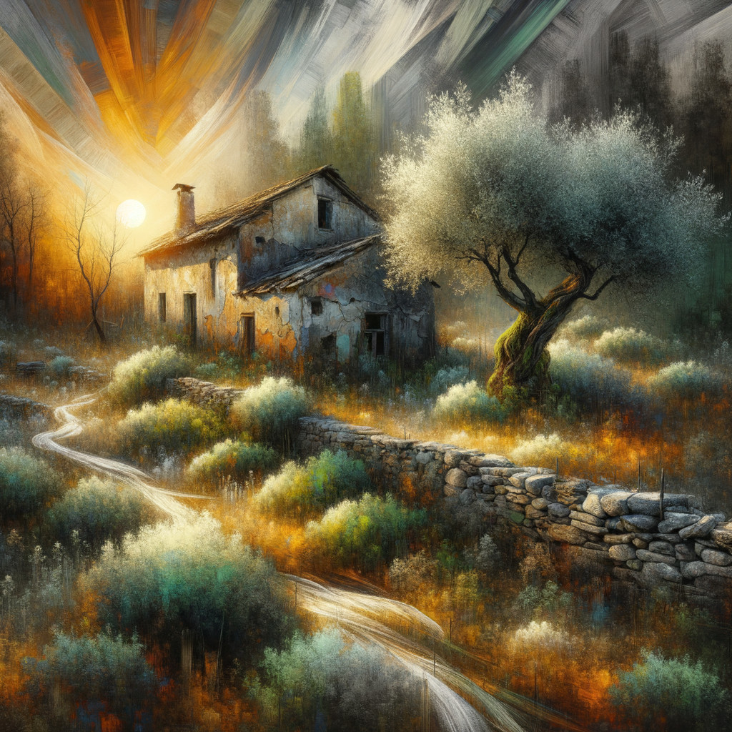 Prompt: Old filthy farmhouse and neglected cottage, old stone wall, olive trees. Atmospheric sunset, dreamy abstract expressionism in a mix of orange, gray and green, streak of yellow, atmospheric sunrise, textured Monet.