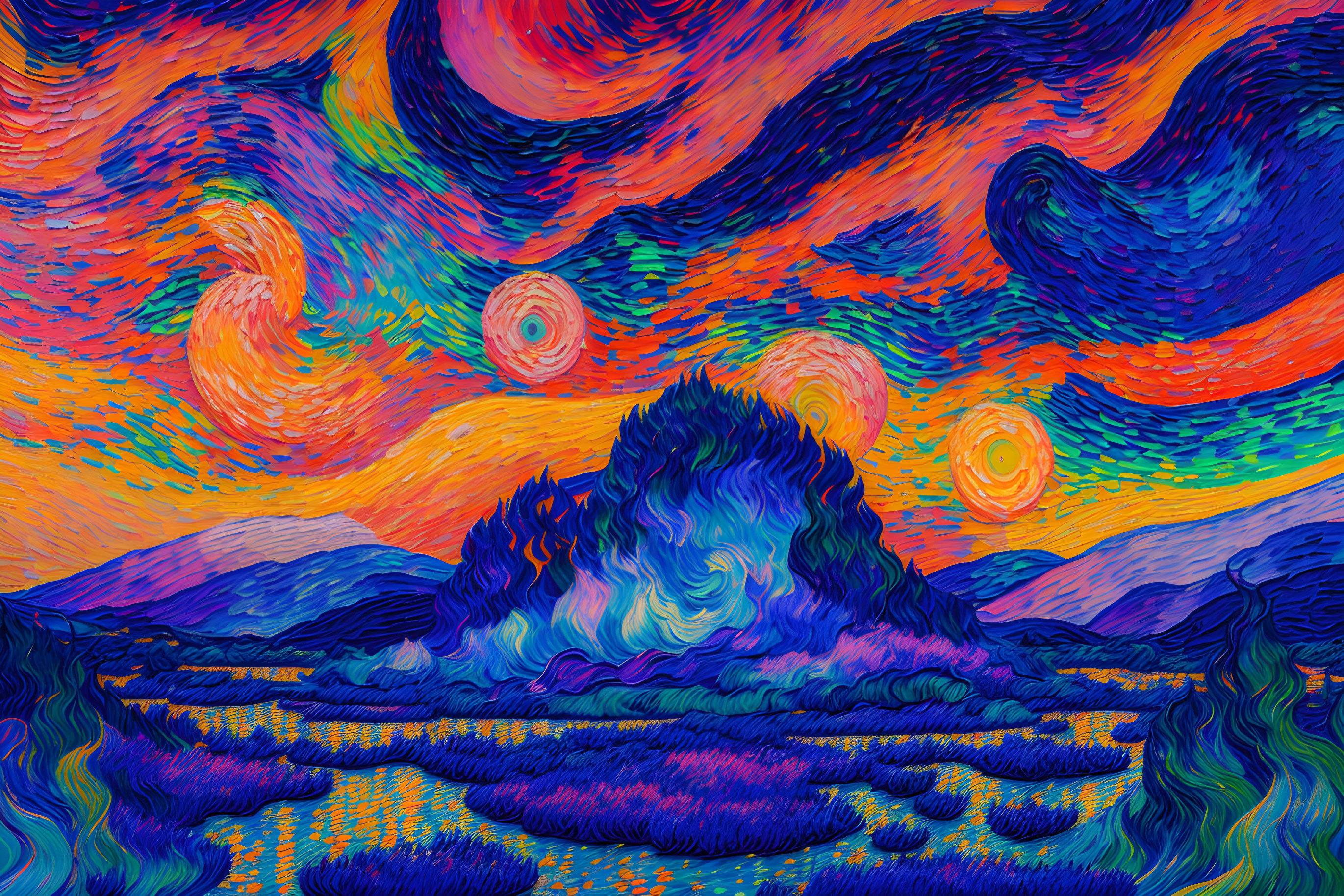 Stunning psychedelic landscape. Oil on canvas by Van Gogh, madness, Arles, Renoir, very thick paint, visible brush strokes, vivid, 64K, UHD, Trending on Artstation, back lit, glowing, acid influence, smoother sky, blue mountains, blended colors