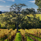 A serene landscape featuring rolling hills adorned with vibrant yellow fields and blooming flowers. Two charming houses are nestled among lush trees under a bright, blue sky with fluffy clouds.