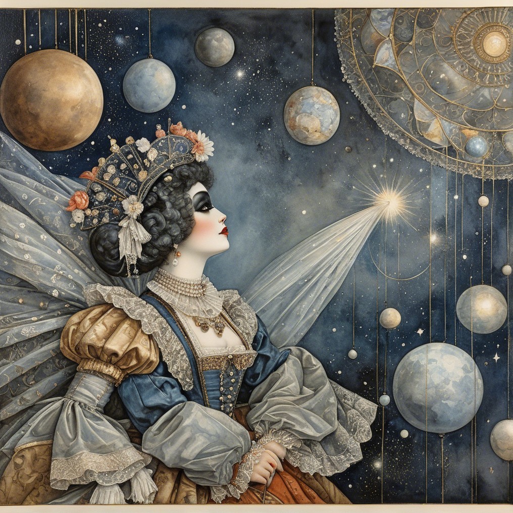 A whimsical painting featuring a woman in a lavish gown adorned with flowers and pearls. She gazes at a moon-like mask, surrounded by floating orbs against a starry backdrop.