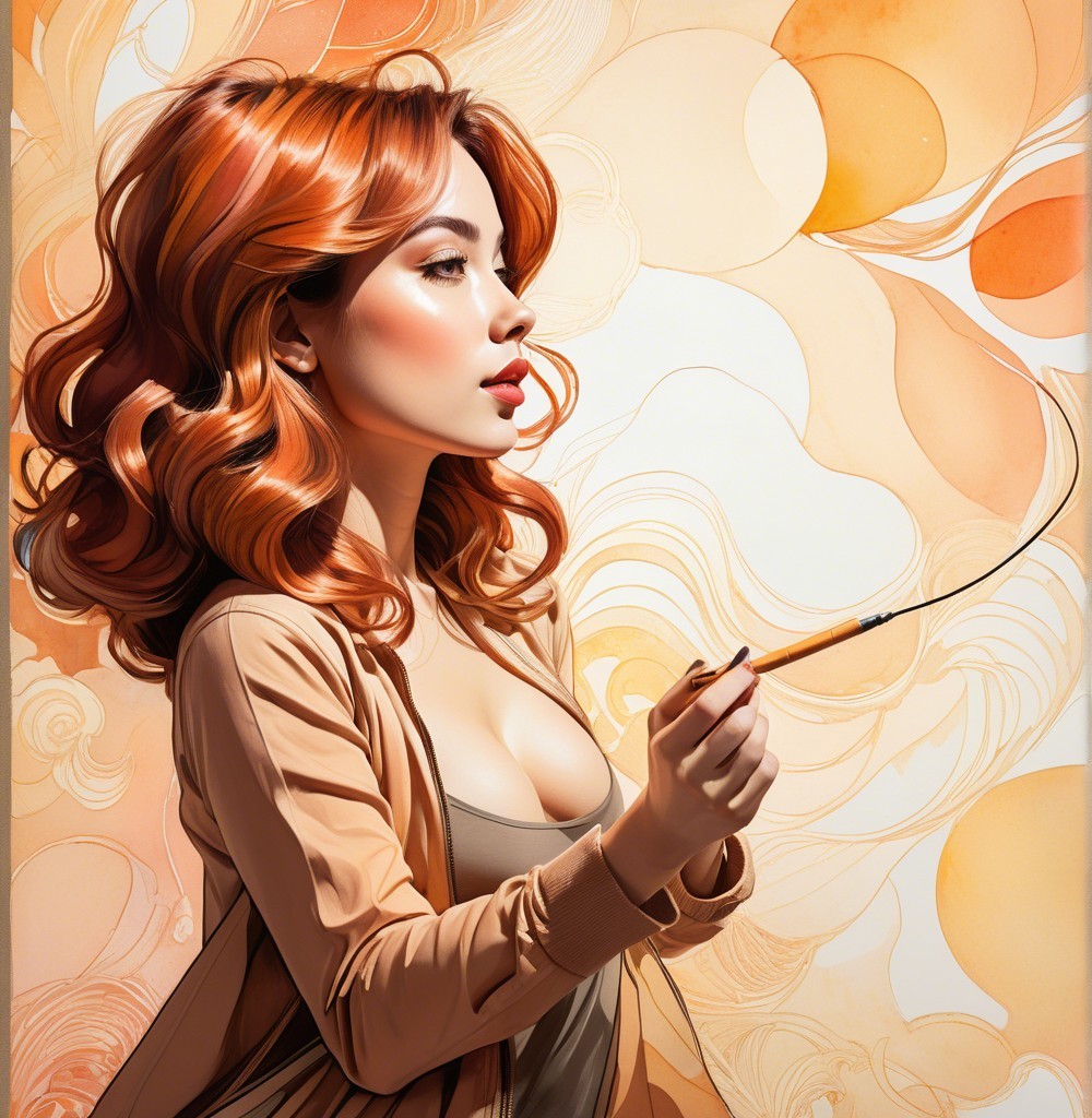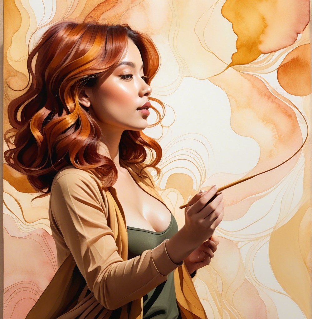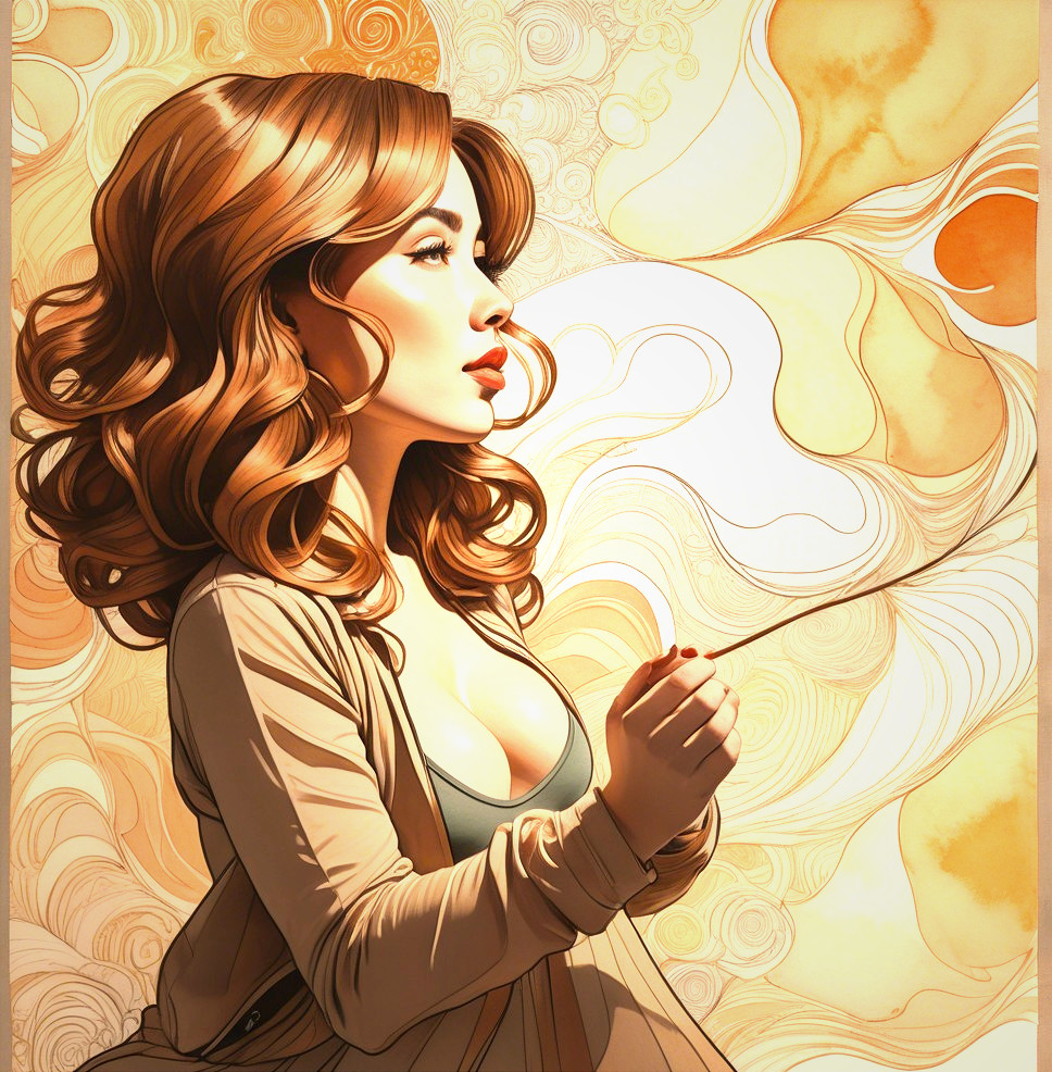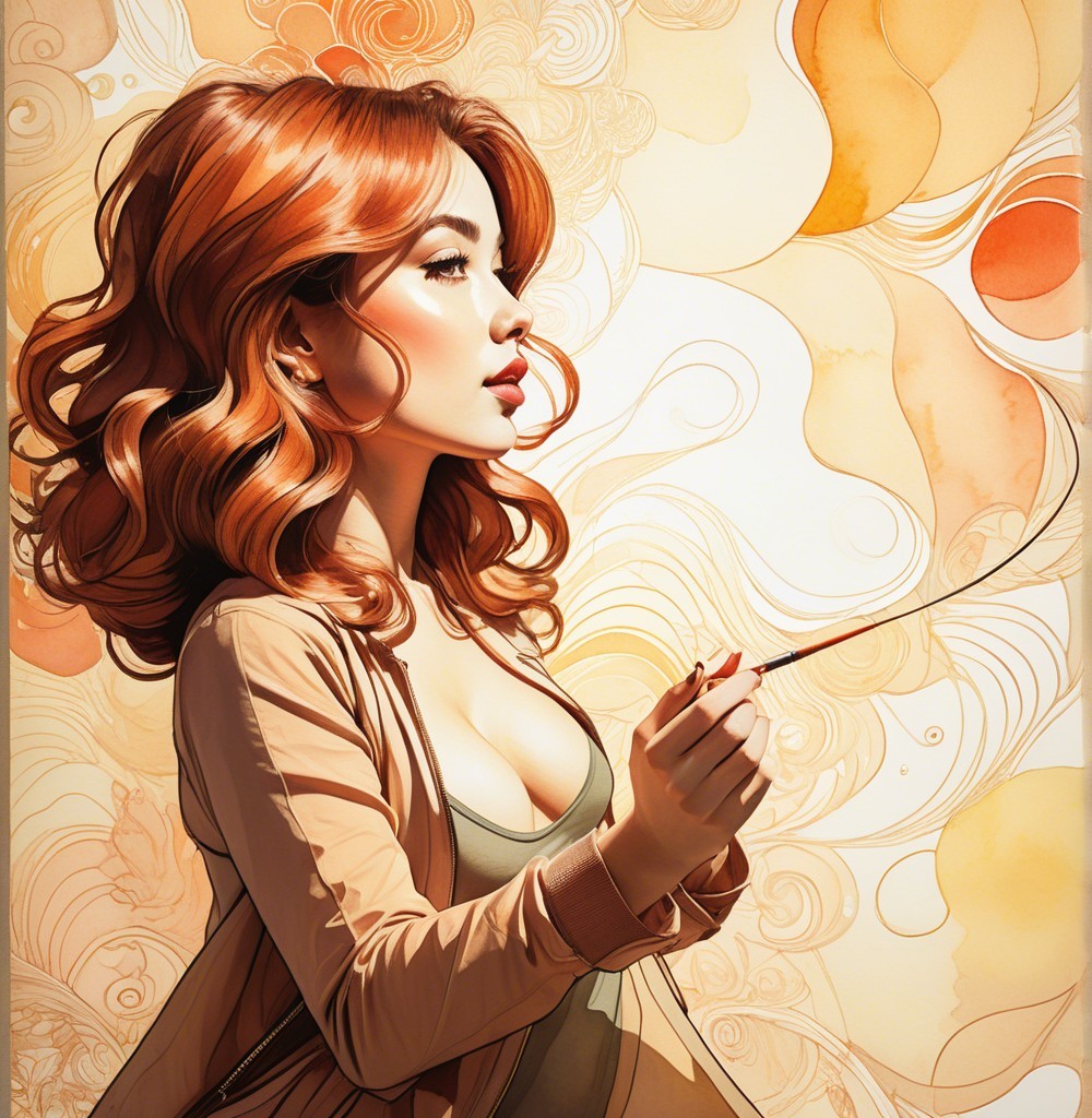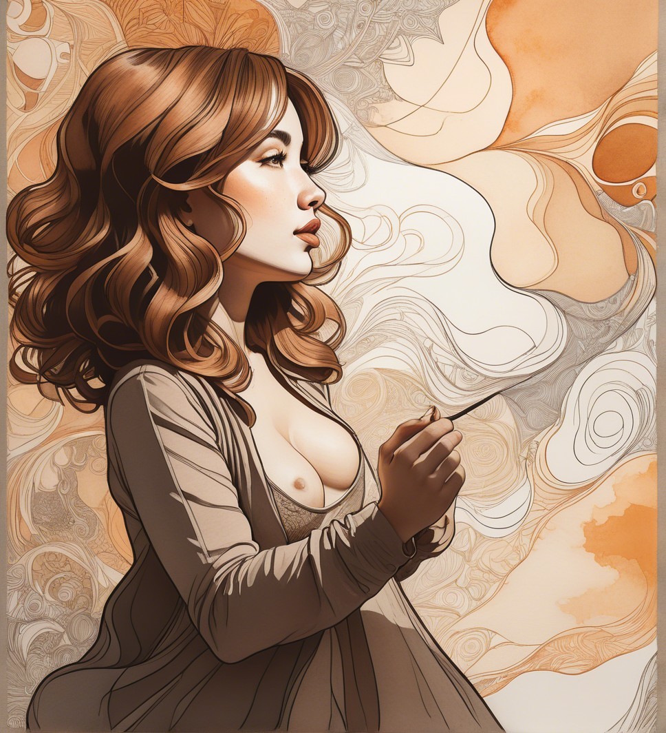 Playful female portraiture, vibrant, whimsical, intricate doodle-style linework, dynamic lighting casting shadows, large expressive shapes in metallic-honey, emulsion lifts, liquid, stylized wavery watercolor textures, overxposed, dreamy warm-toned palette, color scheme of ochre gradient colors of kale and dark-beige, gold-yellow, rust, burgundy, light-grey, light- black, warped handmade sketch-art aesthetic, resembling a hand-drawn comic book, prudish, wavery, micro-pen linework, thin and tall details, catenaries, zentangle, detailed coherent outlines by Tami Bone, earth tones, stacked-up perspective, quilling, erratic hatching, finicky, side view upper body portrait with swirling and floating elements, bold perpendicular contour lines, indiecore merged with 1970's european adult comic book art, 3D watercolor doodle illustration, UHD resolution, HDR for vivid colors, depth of field, texture mapping enhancing depth and scale, rounded and playful shapes, textured paper effect, otherworldly flair, mip-mapping, serene blotting quill pen used for embossed hues by Jackson Pollock, warm 3 point lighting, visible textures, stylized woodblock print by Overton Loyd, hatching, ink and a scratching style, chiseled, plasticity 1.2, sgrafitto style, anthropomorphized, weird, chibli, custom_loss: edge, mental, strict, asymmetrical composition with flowing light, slightly warped, parallax occlusion, foreground with a phong shading of 1.4, abstract brushstroke art, asymmetrical elements, warm coloring, retro-futurism and touch of american gothic, emphasizing shadows and highlights, tousled, delicate tones in a indiecore style, ultra detailed, crisp quality, magical light, filled dreamy,