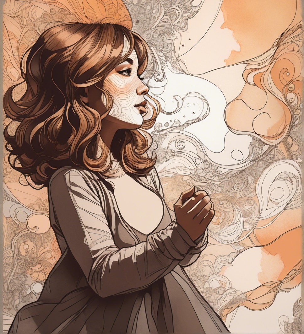 Playful female portraiture, vibrant, whimsical, intricate doodle-style linework, dynamic lighting casting shadows, large expressive shapes, wavery watercolor textures, dreamy warm-toned palette, warped handmade sketch-art aesthetic, resembling a hand-drawn comic book, detailed coherent outlines by Tami Bone, earth tones, erratic hatching, finicky, side view upper body portrait with swirling and floating elements, bold perpendicular contour lines, 3D watercolor doodle illustration, UHD resolution, HDR for vivid colors, depth of field, texture mapping enhancing depth and scale, rounded and playful shapes, textured paper effect, otherworldly flair, mip-mapping, serene blotting quill pen used for embossed hues by Jackson Pollock, warm 3 point lighting, visible textures, stylized woodblock print by Overton Loyd, hatching, ink and a scratching style, chiseled, plasticity 1.2, sgrafitto style, anthropomorphized, weird, chibli, custom_loss: edge, mental, strict, asymmetrical composition with flowing light, slightly warped, parallax occlusion, foreground with a phong shading of 1.4, abstract brushstroke art, asymmetrical elements, warm coloring, retro-futurism and touch of american gothic, emphasizing shadows and highlights, tousled, delicate tones in a indiecore style,
