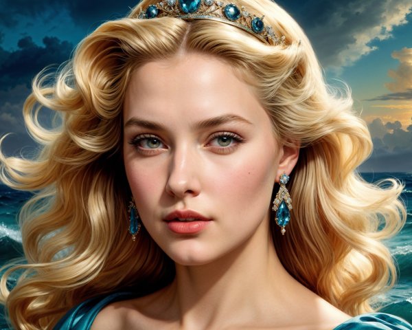 A young woman in a floral crown gazes thoughtfully towards a distant castle atop a hill, surrounded by vibrant flowers, set against a dreamy, picturesque landscape.