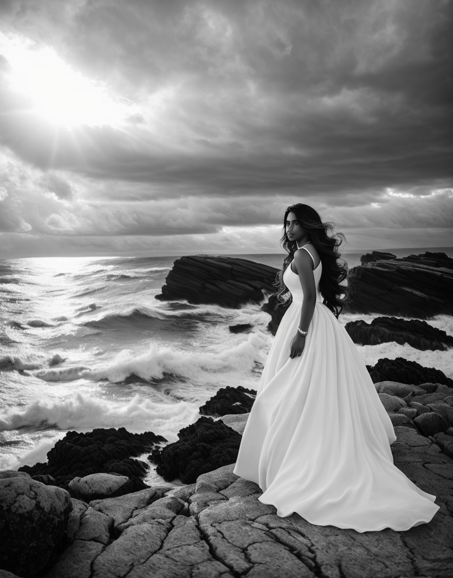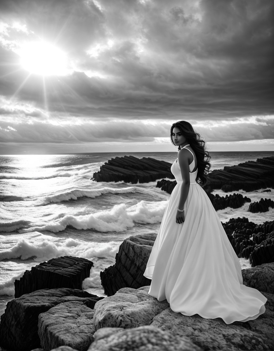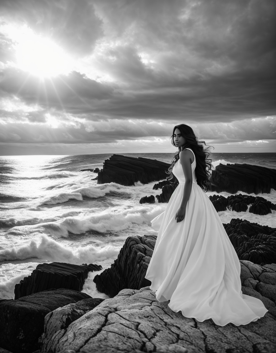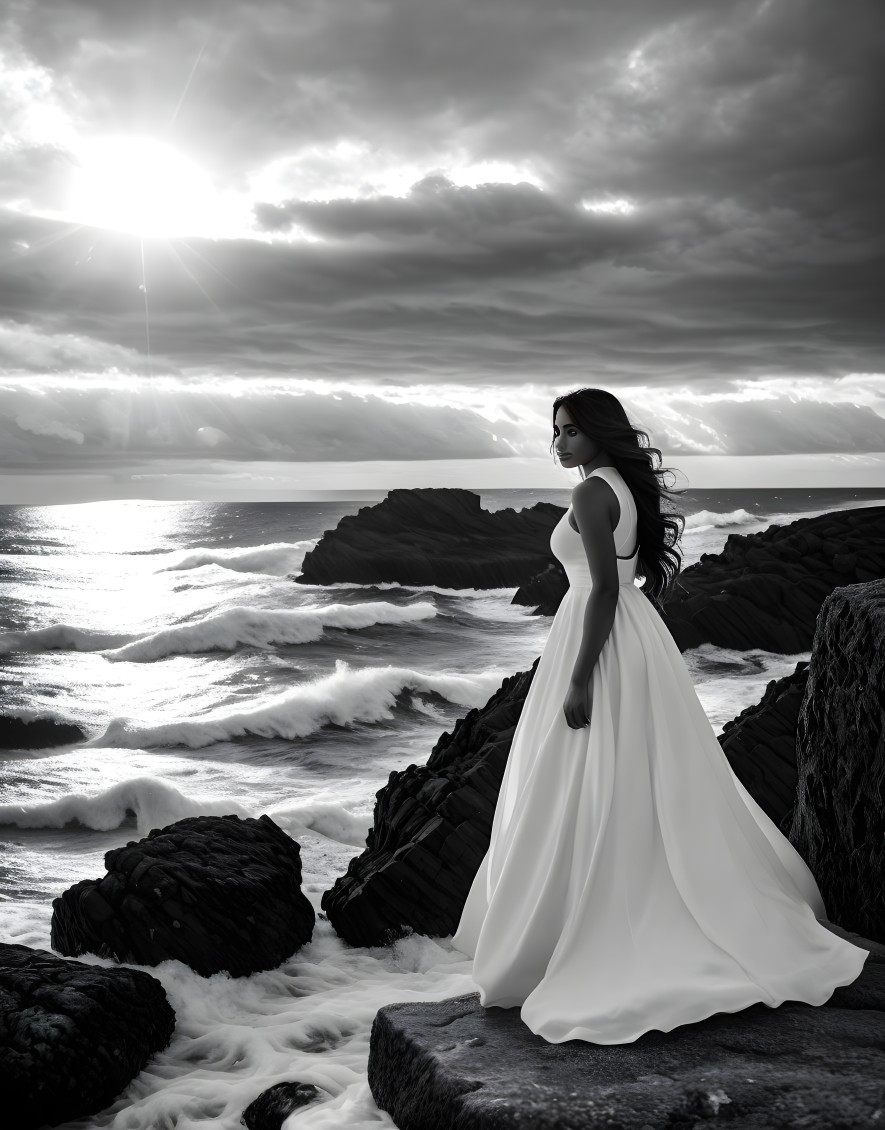 Prompt: "a black and white image of a woman in a white dress standing on a rocky shore. Her hair is flowing in the wind, and the ocean with waves and clouds can be seen in the background. The sun is shining through the clouds, creating a dramatic and beautiful scene."