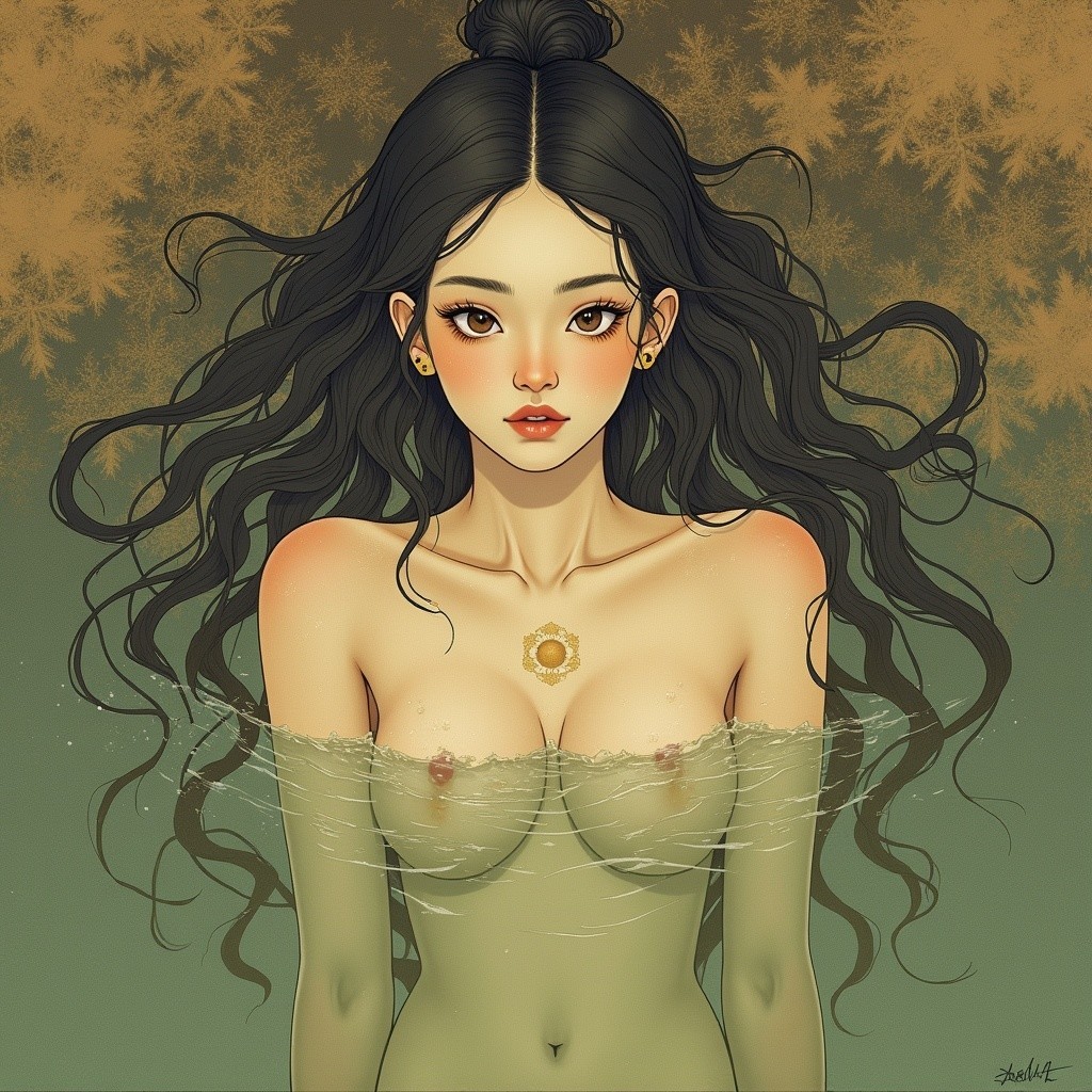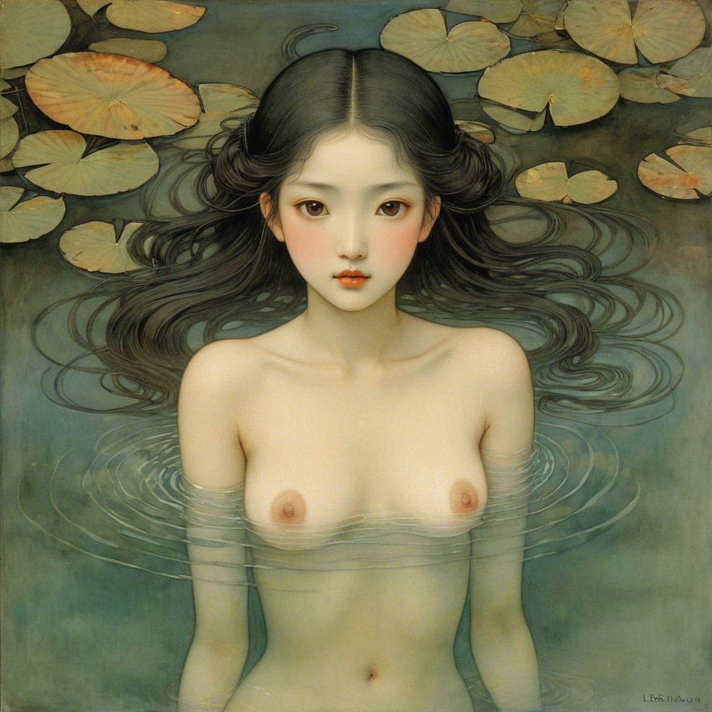 A serene portrait of a young woman submerged in water, surrounded by lily pads. She has long, flowing hair adorned with flowers, and her tranquil expression evokes a sense of calm and beauty.