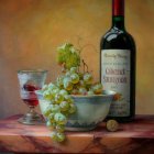 A bottle of red wine stands beside a glass filled with wine, surrounded by plump grapes and seashells on a wooden surface, illuminated by warm, soft light, creating an elegant ambiance.