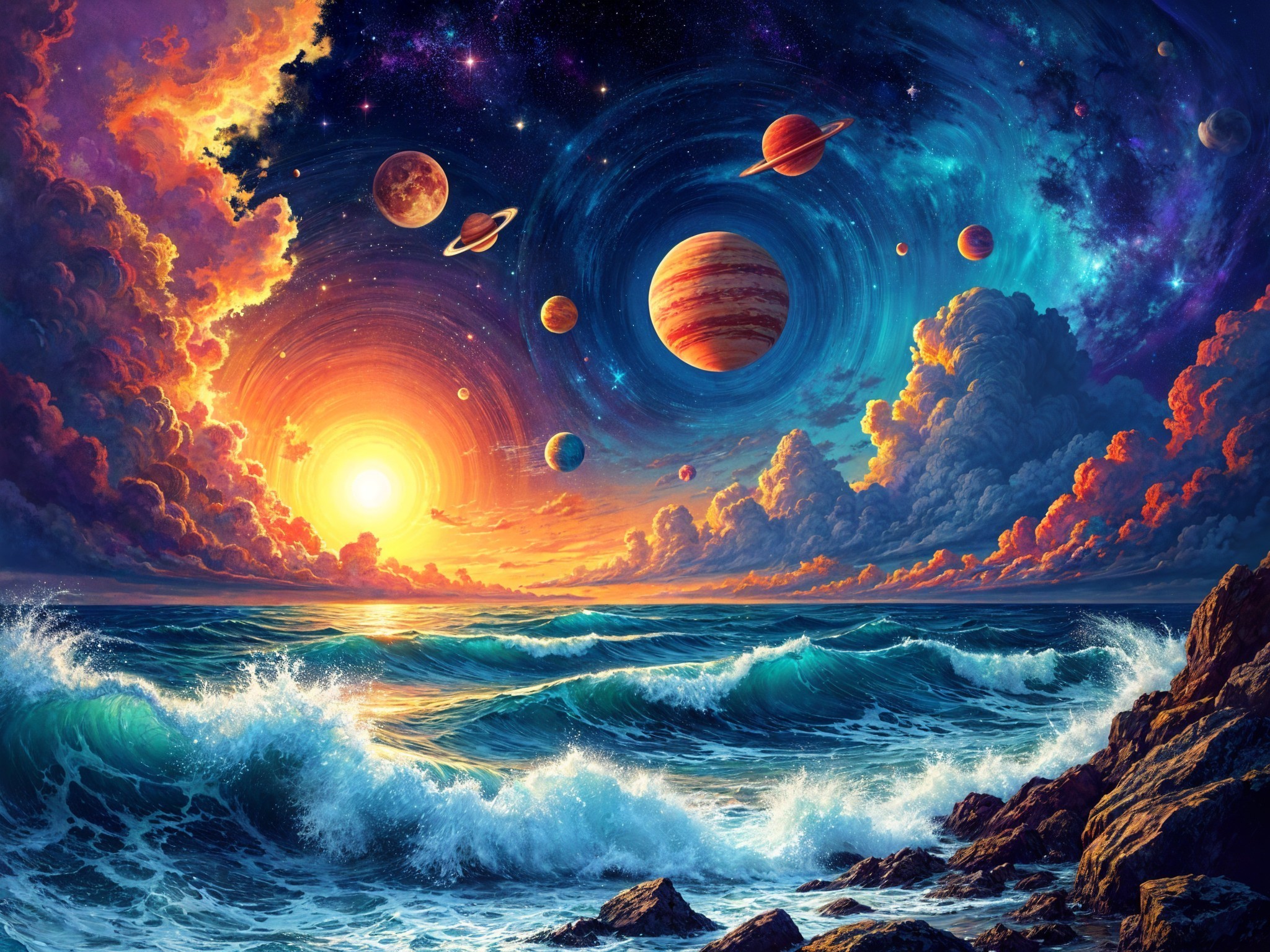 Prompt: "Create a vibrant and dynamic seascape where the ocean merges with a cosmic sky. The foreground features powerful, rolling waves with peaks of white foam, rendered in shades of deep blue and green, reflecting sunlight. The waves are approaching a rocky shoreline. Sunlight refracts through the ocean spray, casting golden highlights on the water's surface, mirroring the sun's circular shape, which sits partially obscured by the waves but intensely luminous.