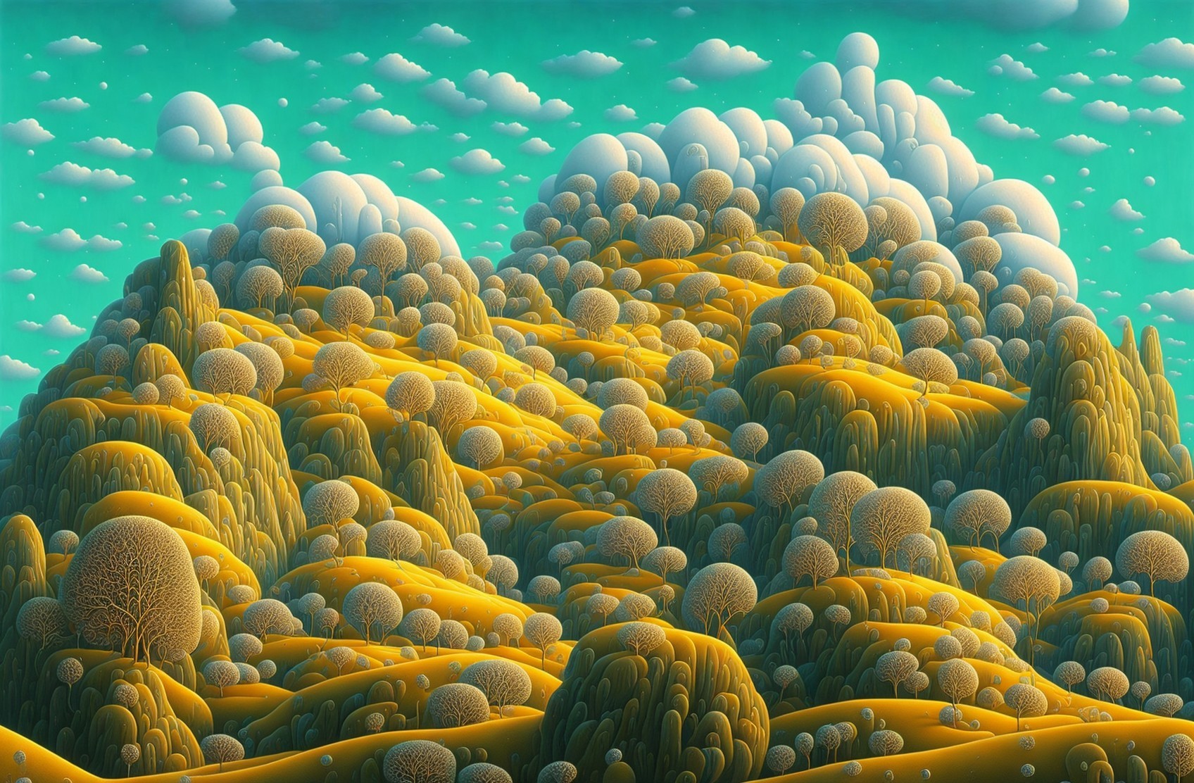 A vibrant, surreal landscape with rolling hills, colorful trees, and a quaint village under a dynamic cloudy sky.