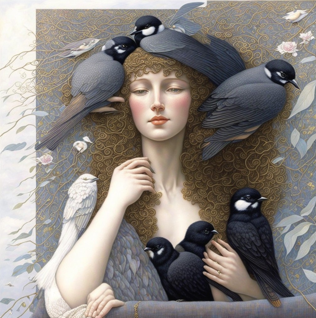 Prompt: I haven't lived life, I haven't lived love. Just bird's eye view from the sky above". Love is a fragile thread, woven through moments. This artwork amalgamates the artistic styles of Michael Parkes,