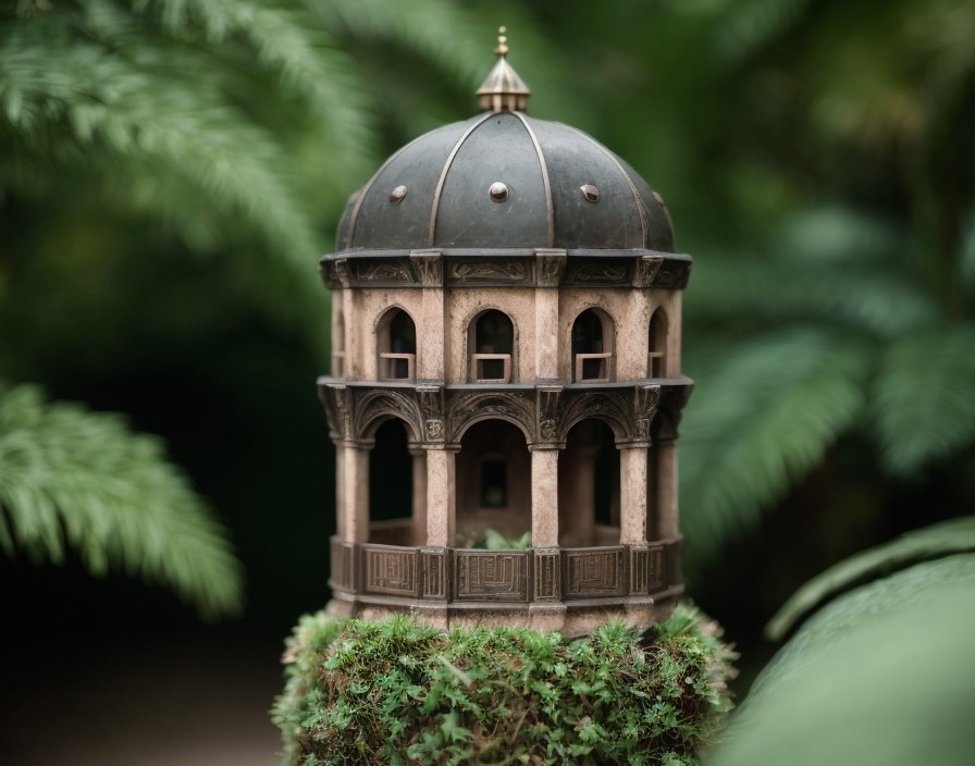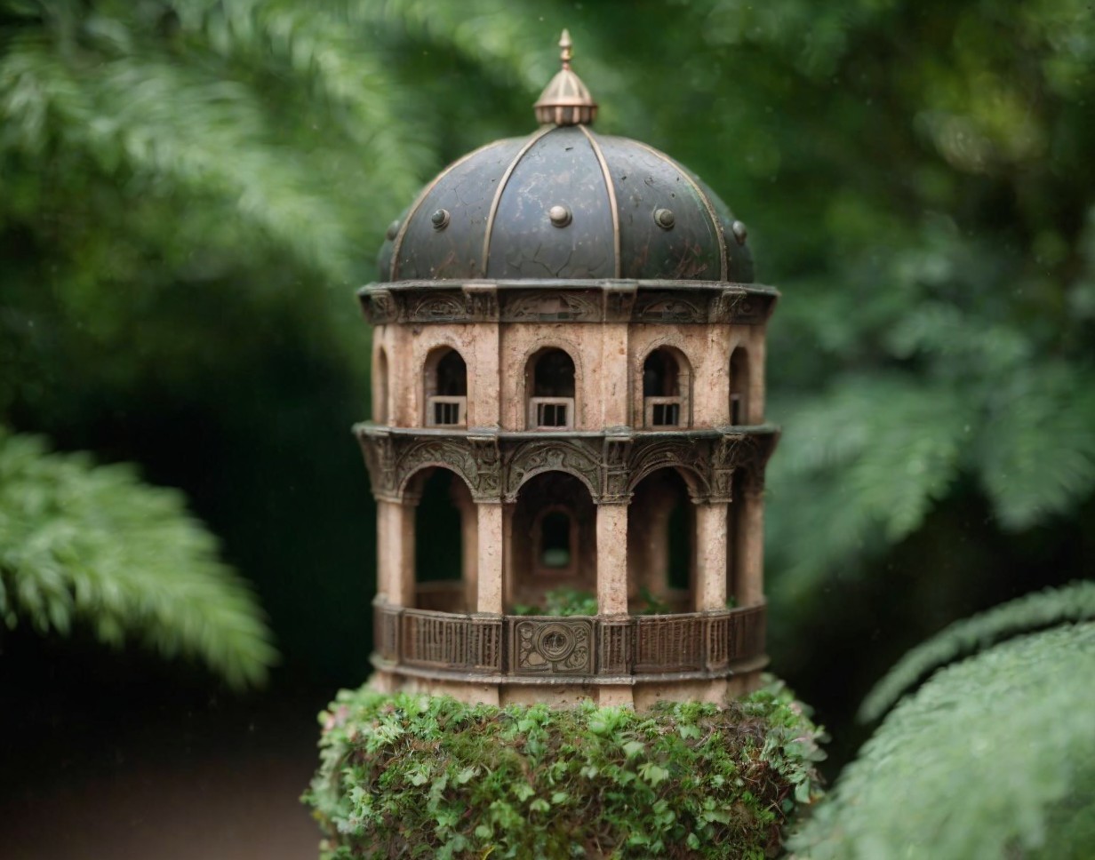 A beautifully detailed miniature structure with a domed roof and classical arches, perched atop lush green moss, surrounded by vibrant foliage, creating a whimsical, enchanting scene.
