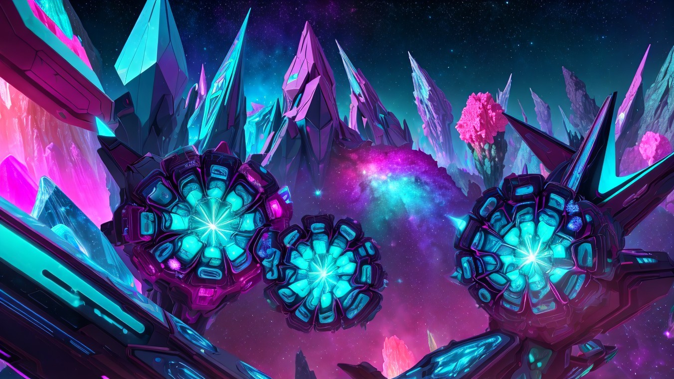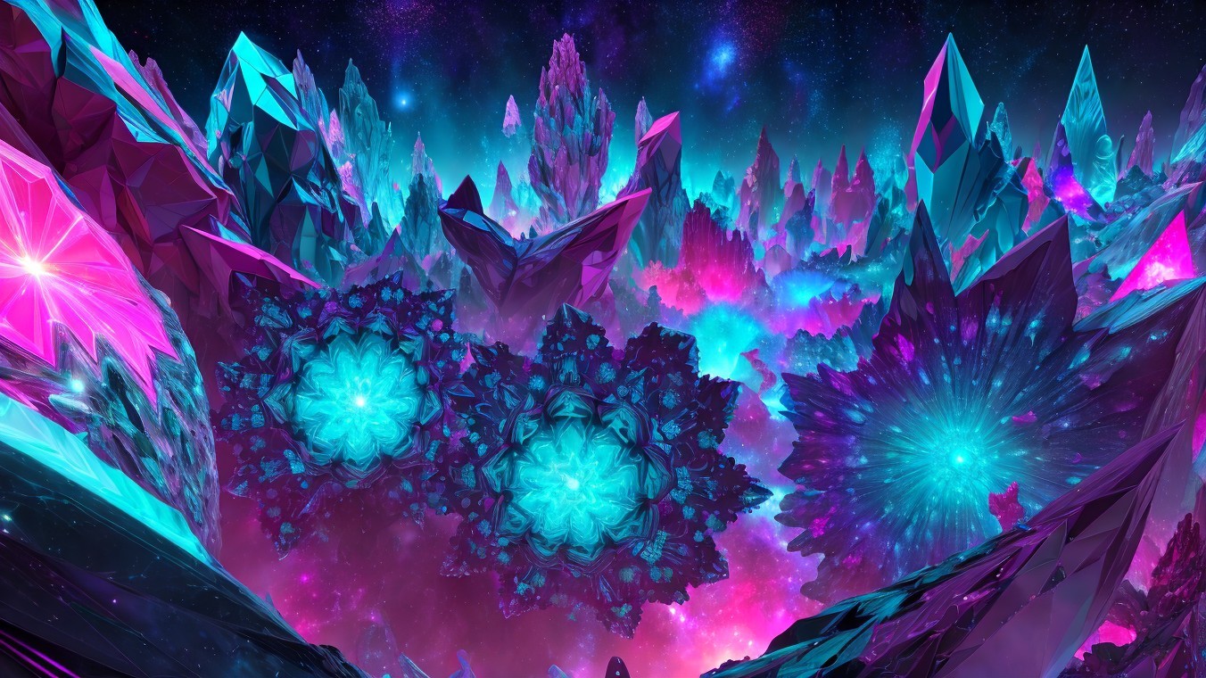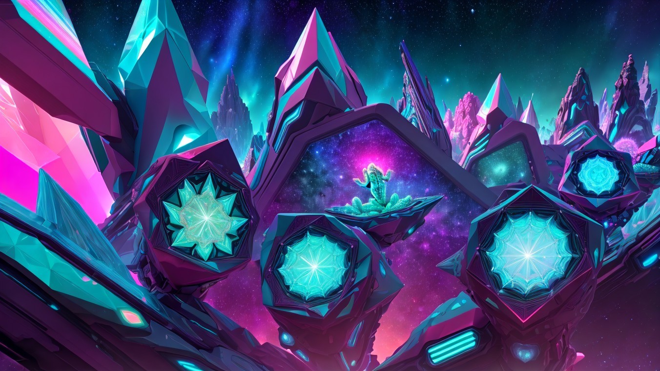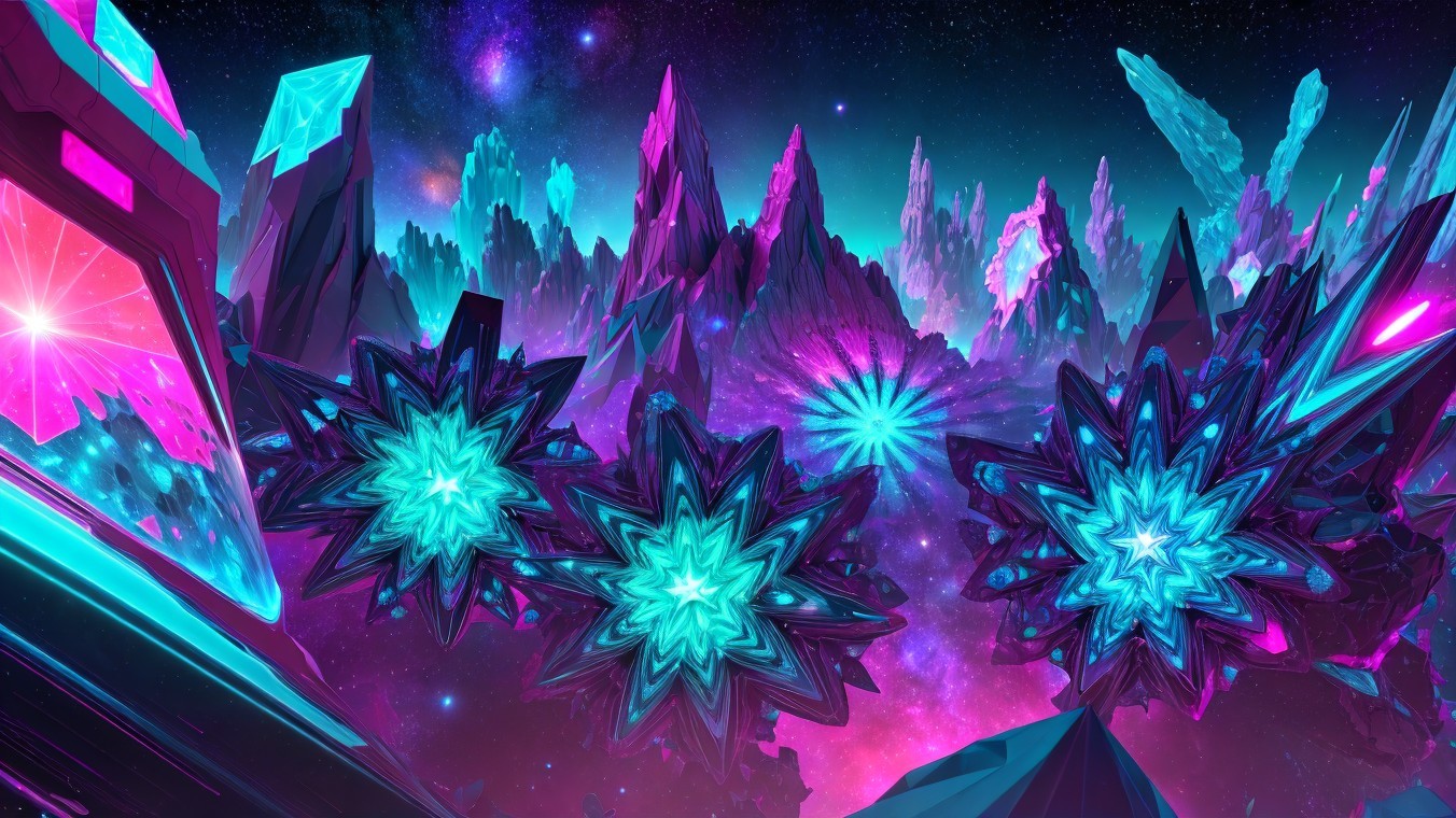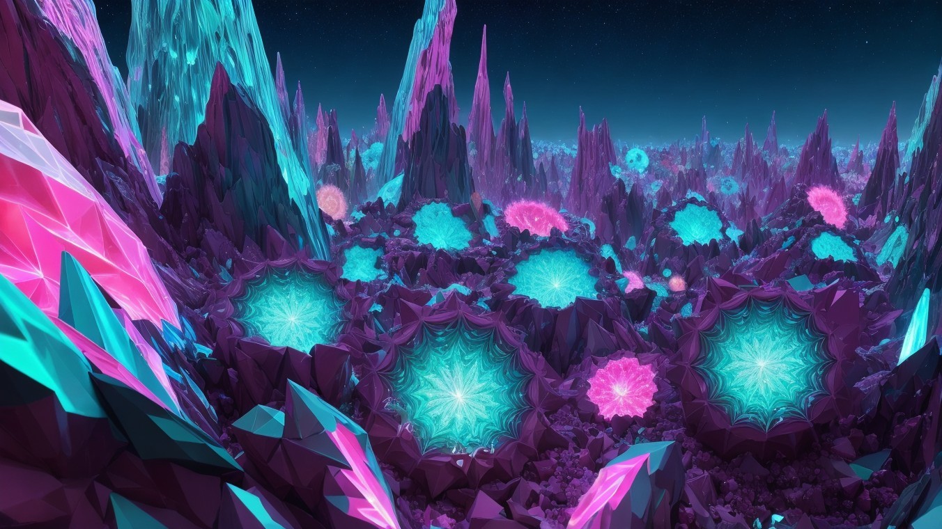 A vibrant landscape with glowing neon crystals and pyramids under a starry sky, exuding a mystical and otherworldly aura.