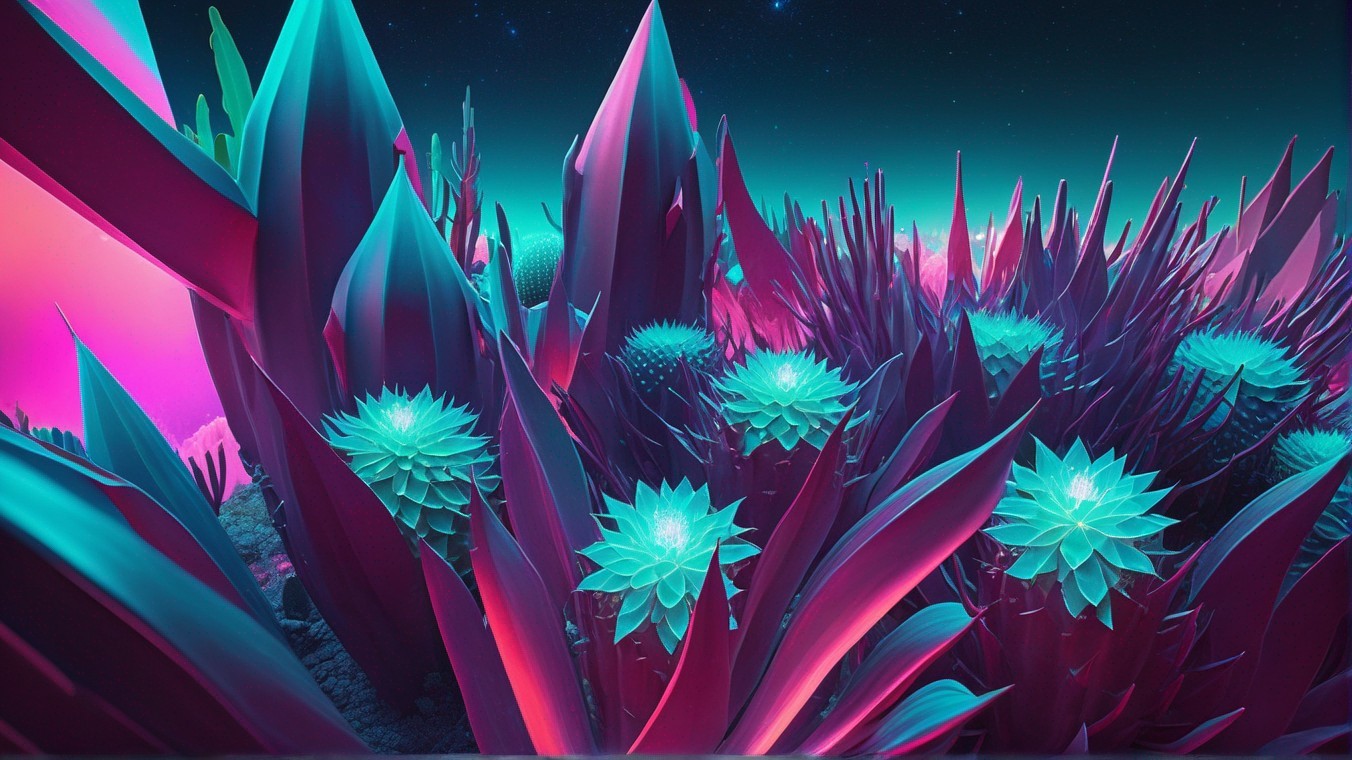+ Prompt:A cactus entity. Vibrant cosmic colors, intricate fractal patterns, crystal-like textures, futuristic space theme, surreal galaxy background, hues of maroon, aqua, and coral pink, glowing elements, sharp geometric shapes, digital art, high resolution, detailed and mesmerizing design, glowing neon lights, cosmic energy vibes, by digital artist Beeple, Artstation.