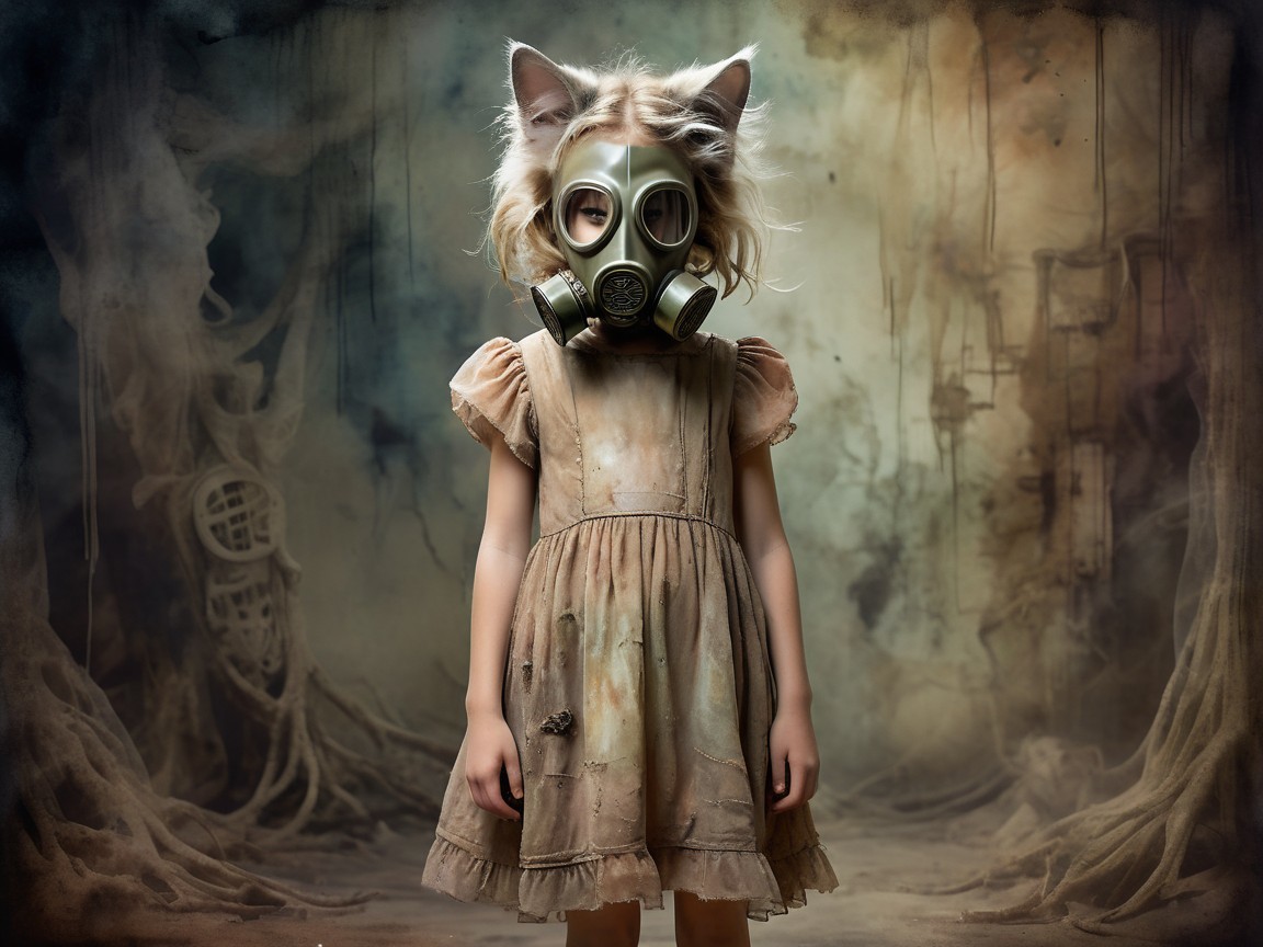 (Try from basyrmanda) - A child in a dusty, torn dress wears a gas mask, blending innocence with a surreal, eerie atmosphere. The background features abstract, shadowy forms, enhancing the unsettling mood.