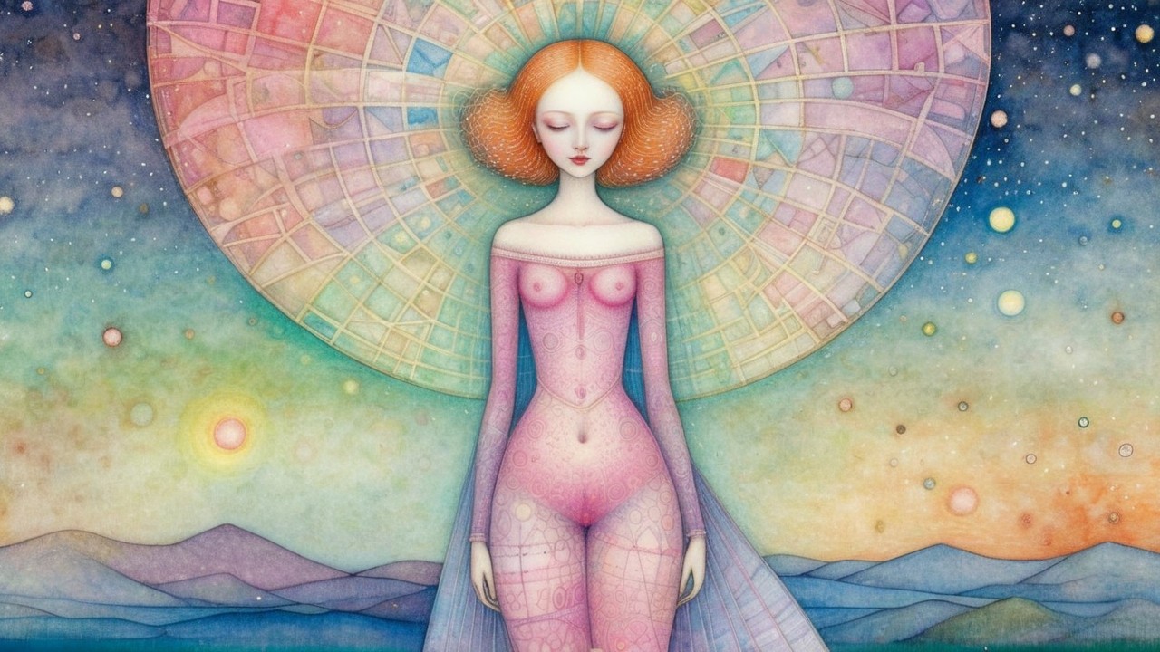 A whimsical watercolor painting depicts a pale-skinned woman with closed eyes and reddish-orange hair in a style reminiscent of Art Nouveau, with large curls above her ears. She wears a pink, long-sleeved, skin-tight garment that reveals the contours of her breasts. The garment is adorned with