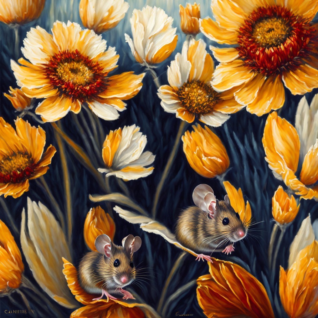 Two mice nestle and wander among towering yellow and ivory blossoms, rendered in bold painterly strokes. The scene glows with warmth and tranquility, suggesting a moment of unexpected peace in nature’s usual cycle of tension.