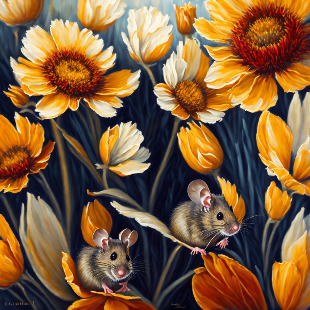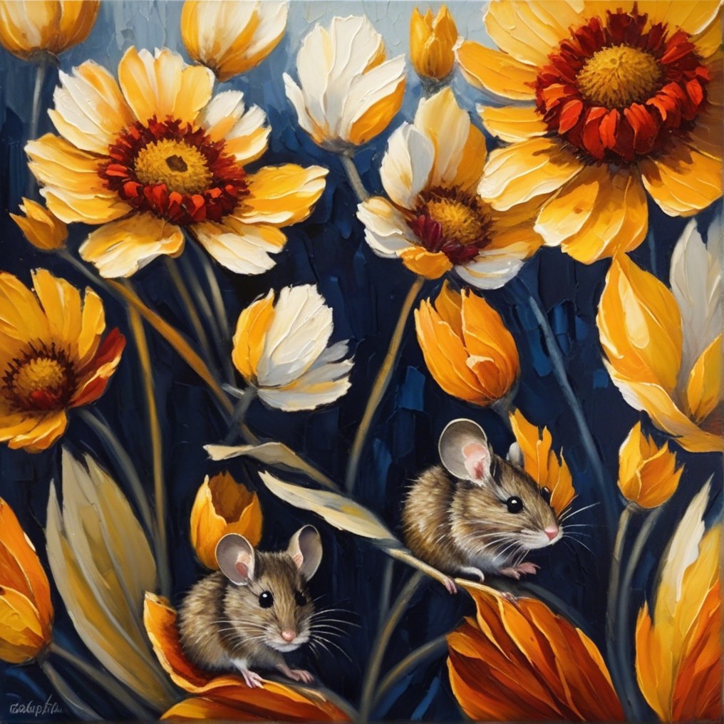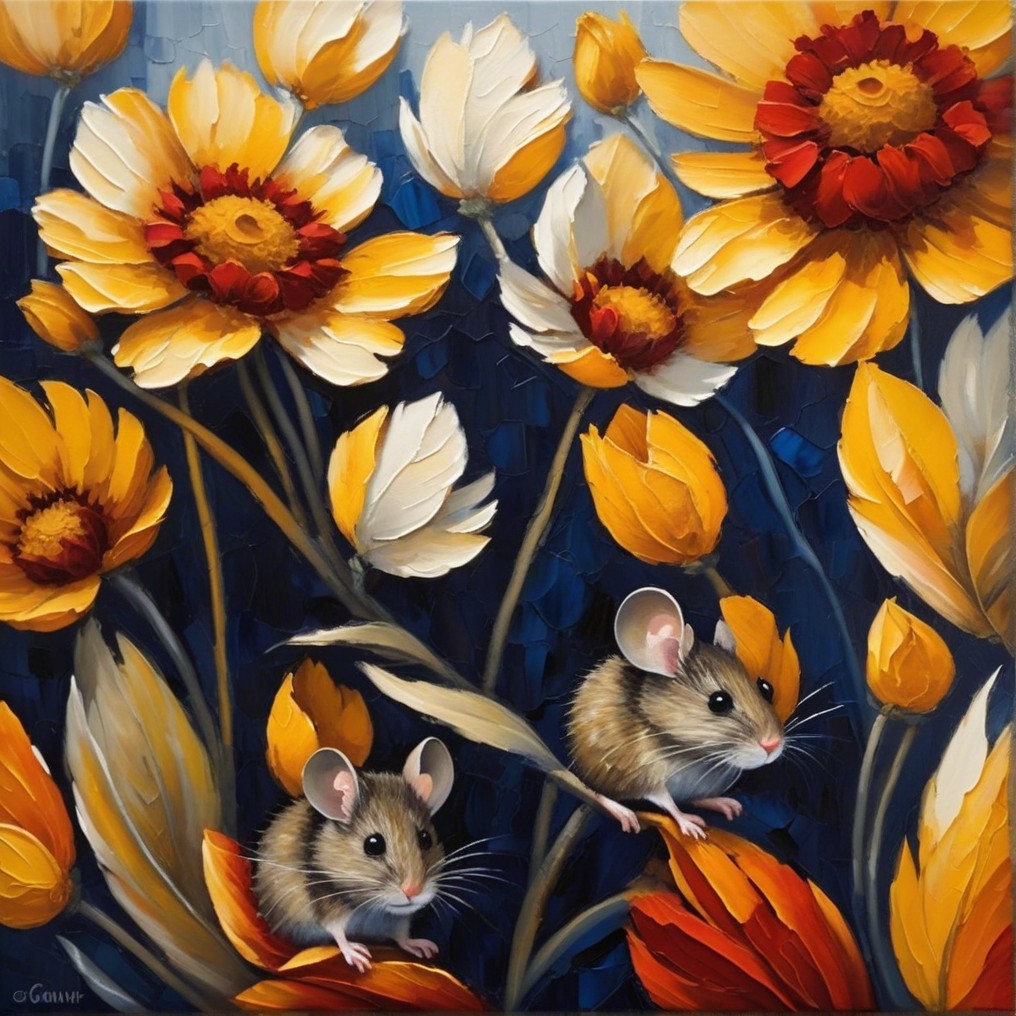 Artistic Statement: This piece fuses impressionist floral motifs with naturalist animal illustration, blending Van Gogh-esque impasto with the whimsy of storybook realism. The brushwork evokes the texture of thick oil paint, while the composition echoes classical garden still lifes, reimagined through a rodent's vantage point.