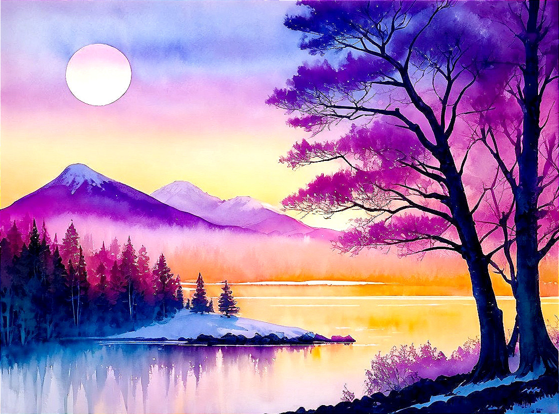 A serene landscape featuring vibrant purple and pink hues, with a glowing sun above misty mountains. Tall trees line the shore of a tranquil lake, reflecting the colorful sky.